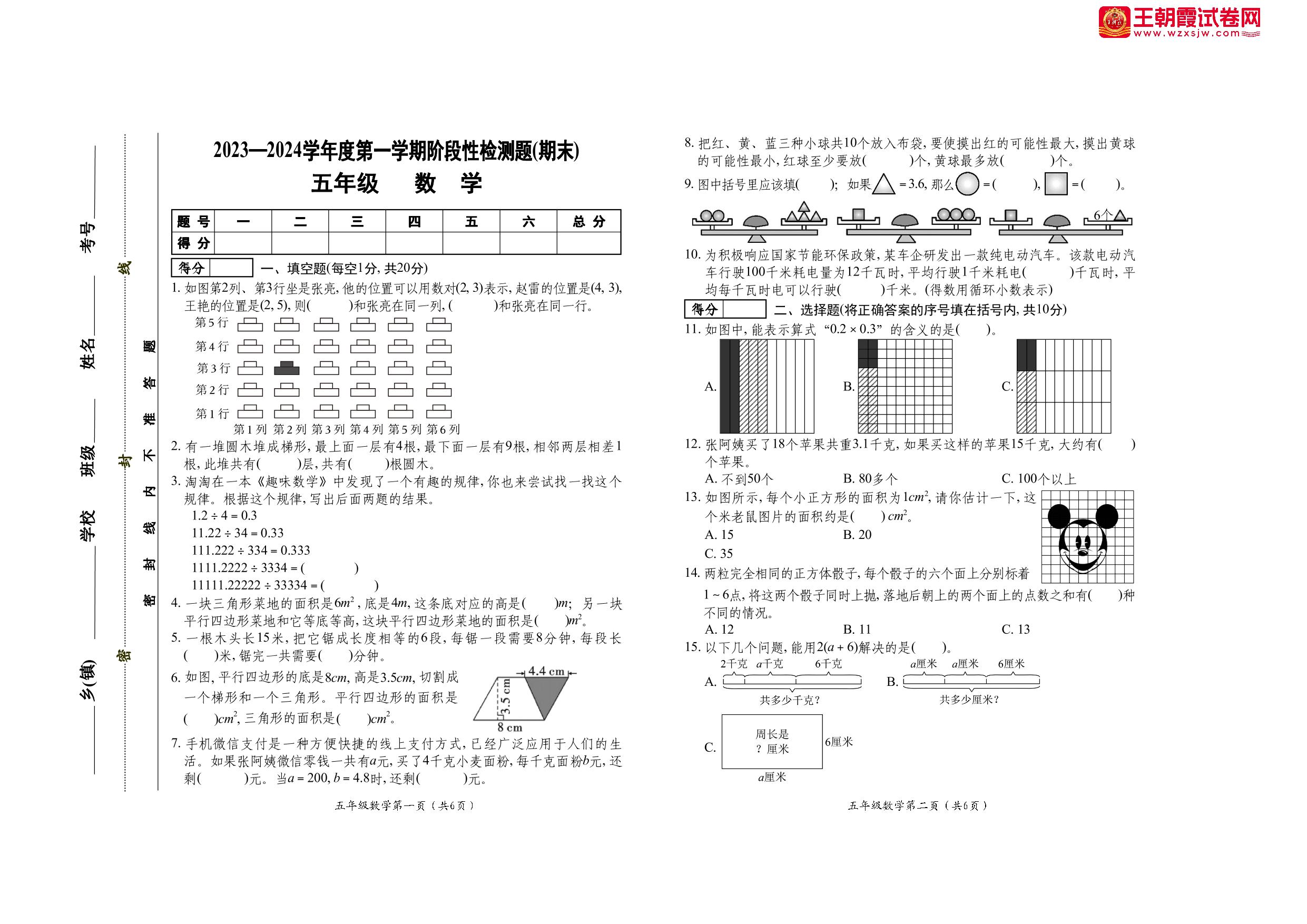 山西省晋中市祁县2023-2024学年度第一学期阶段性检测题(期末)五年级数学(人教版)