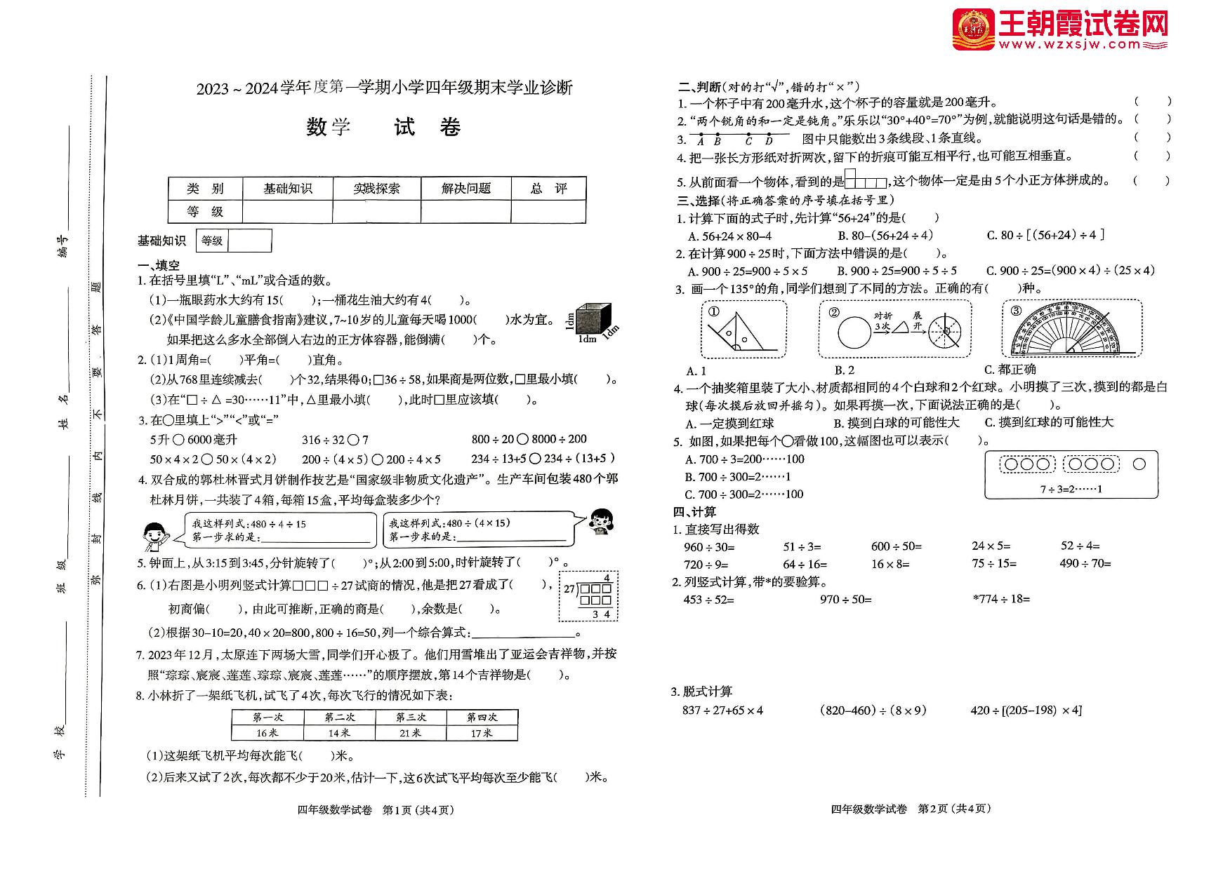 山西省太原市晋源区2023-2024学年度第一学期期末学业水平诊断四年级数学(苏教版)