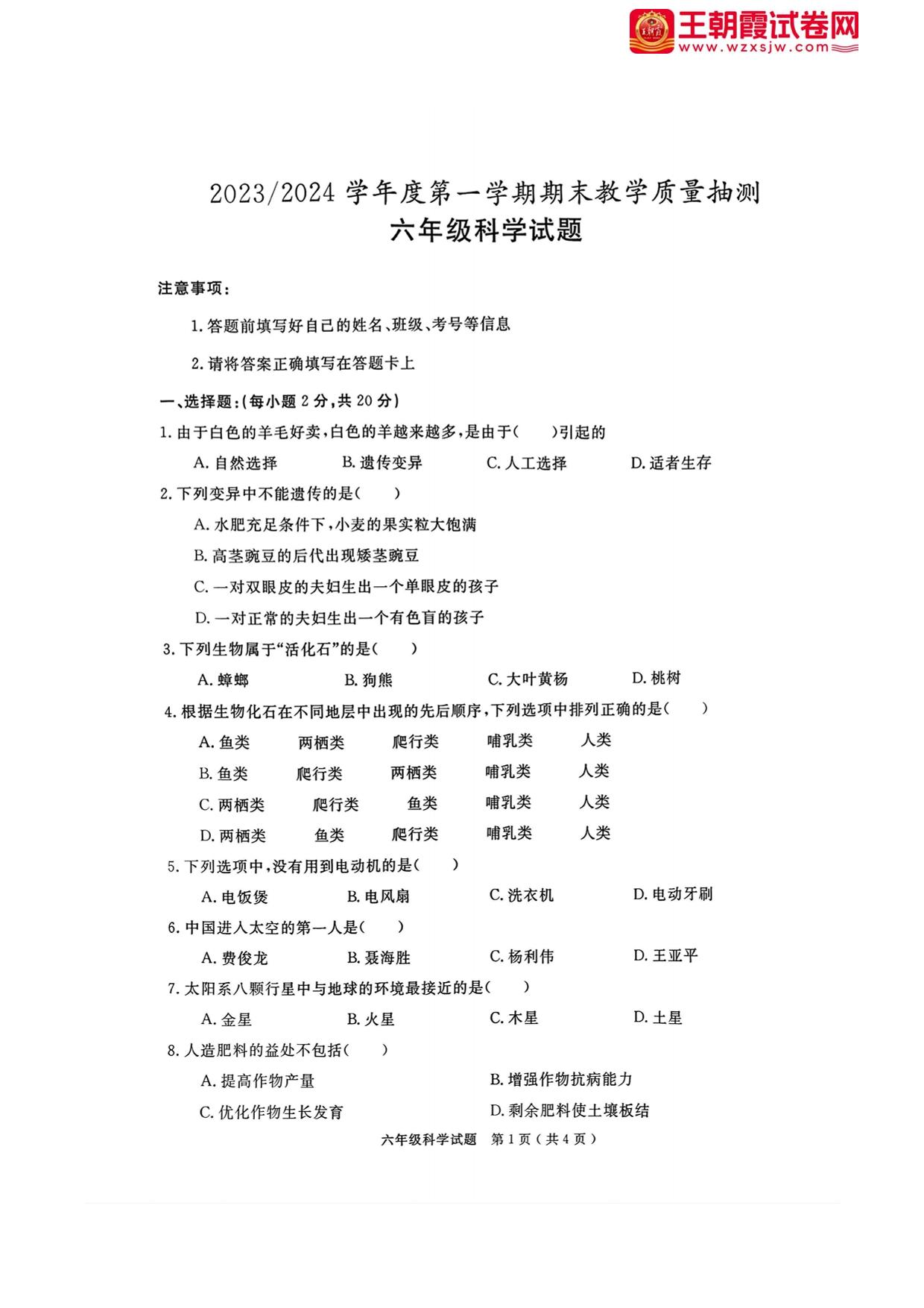 安徽省合肥市庐江县2023-2024学年度第一学期期末教学质量抽测六年级科学(教科版)