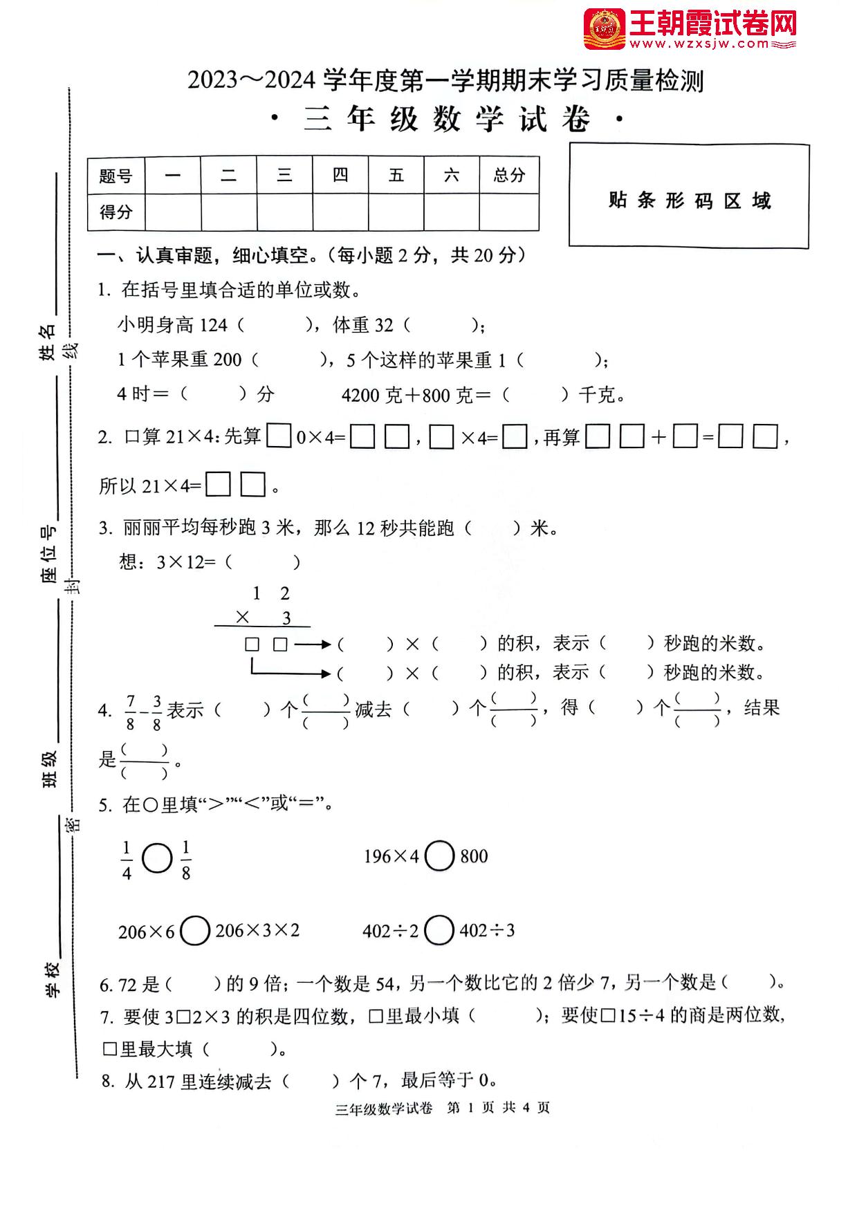 安徽省芜湖市无为市2023-2024学年度第一学期期末学习质量检测三年级数学(苏教版)