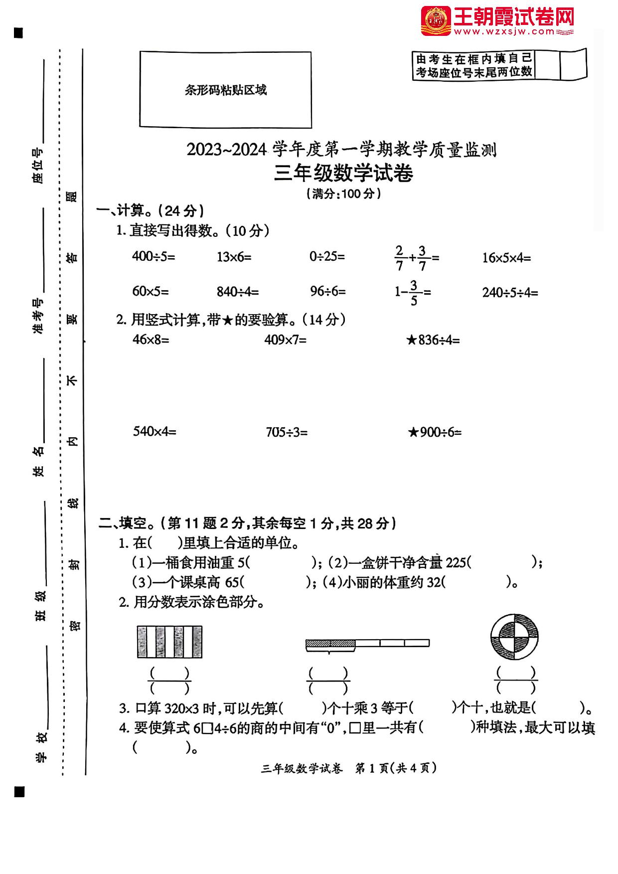 安徽省滁州市2023-2024学年度第一学期教学质量监测三年级数学(苏教版)