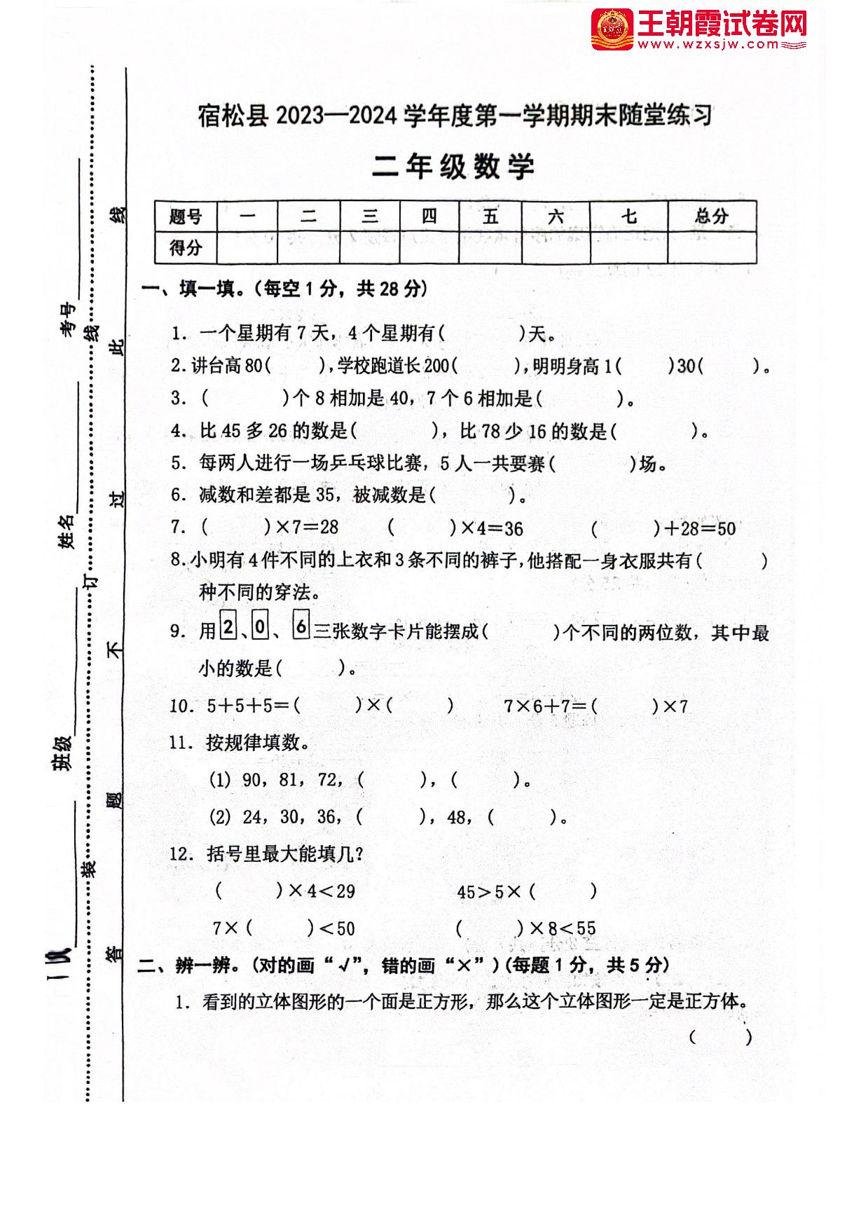 安徽省安庆市宿松县2023-2024学年度第一学期期末随堂练习二年级数学(人教版)
