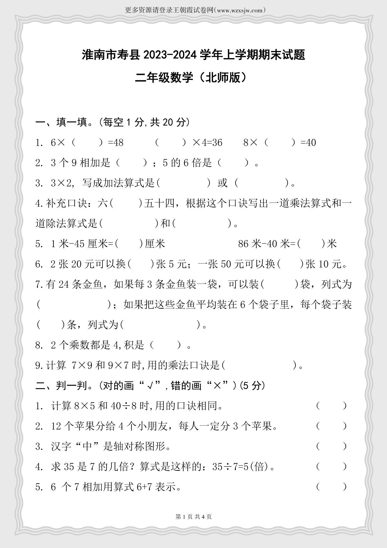安徽省淮南市寿县2023-2024学年上学期期末试题二年级数学(北师版)