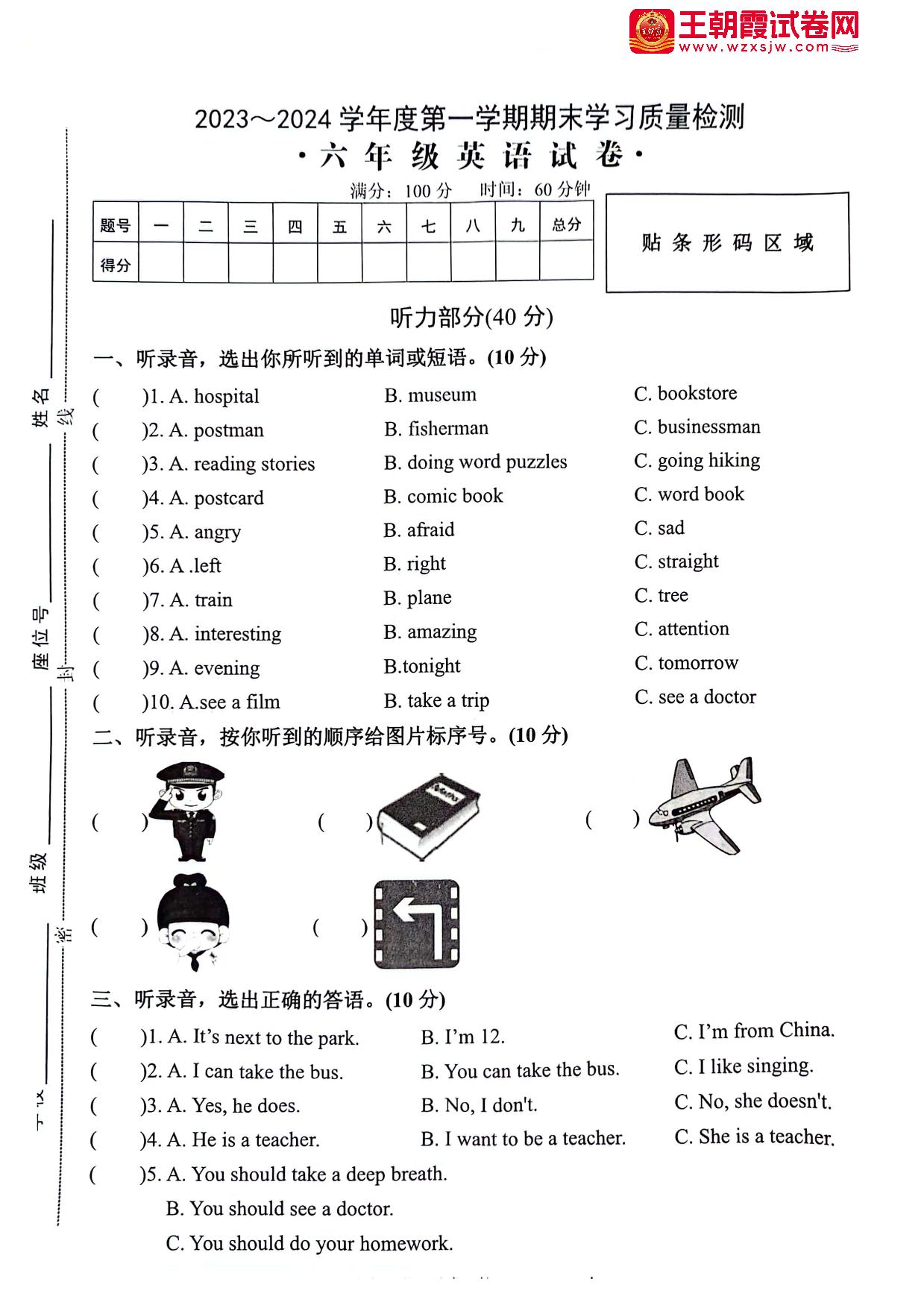 安徽省芜湖市无为市2023-2024学年度第一学期期末学习质量检测六年级英语(人教PEP版)