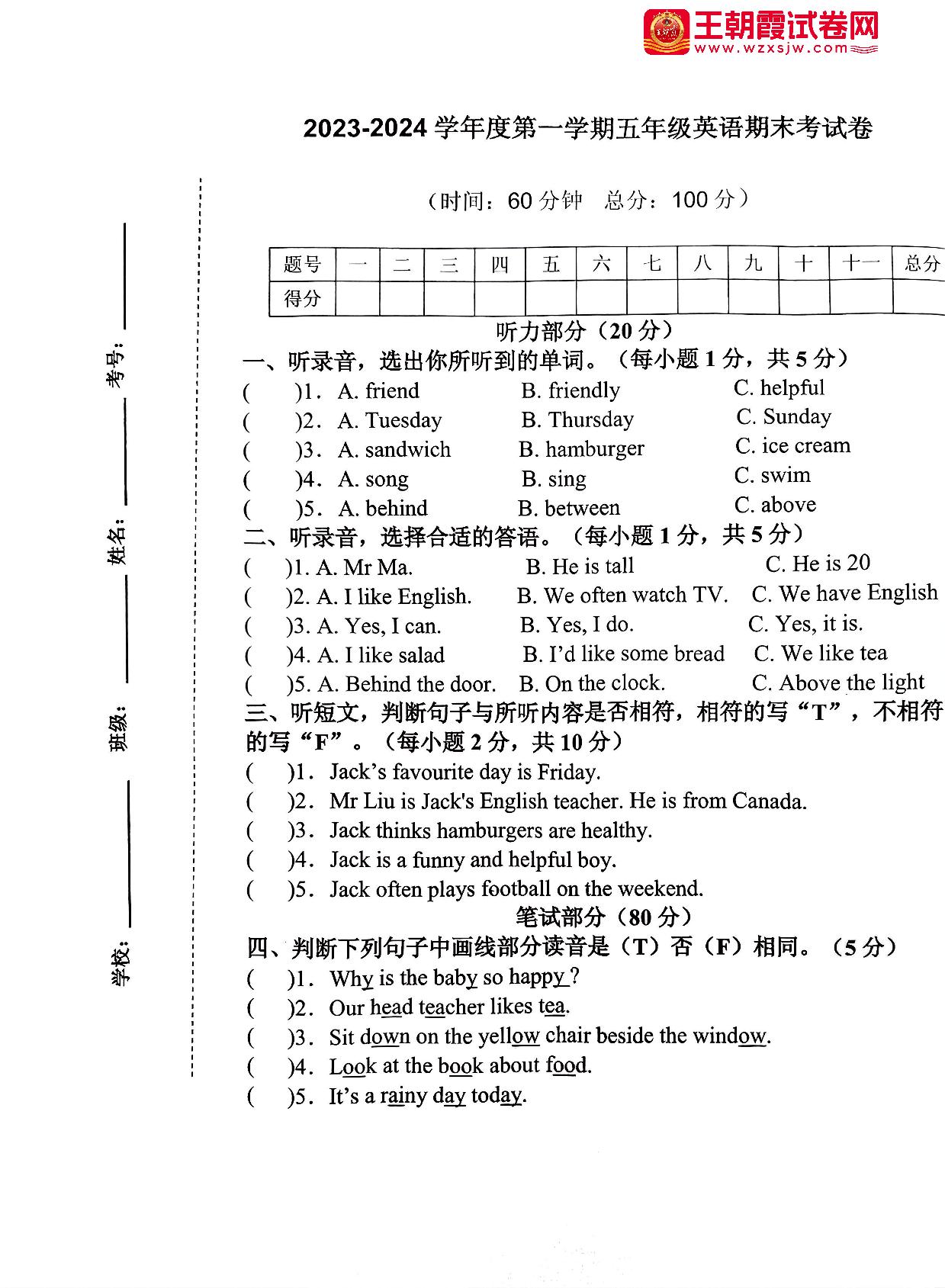 五年级英语人教PEP版(三起始)上册期末卷