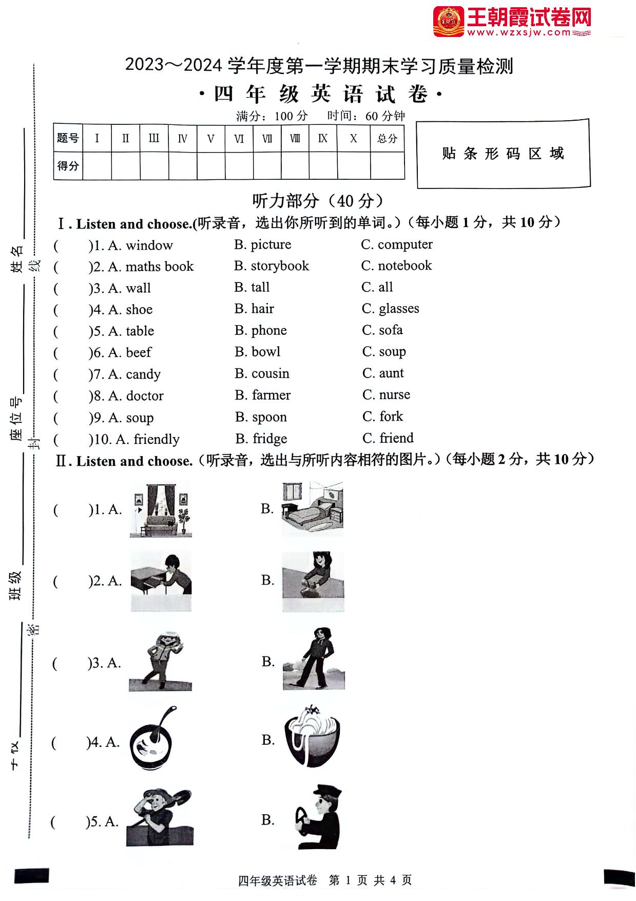 安徽省芜湖市无为市2023-2024学年度第一学期期末学习质量检测四年级英语(人教PEP版)