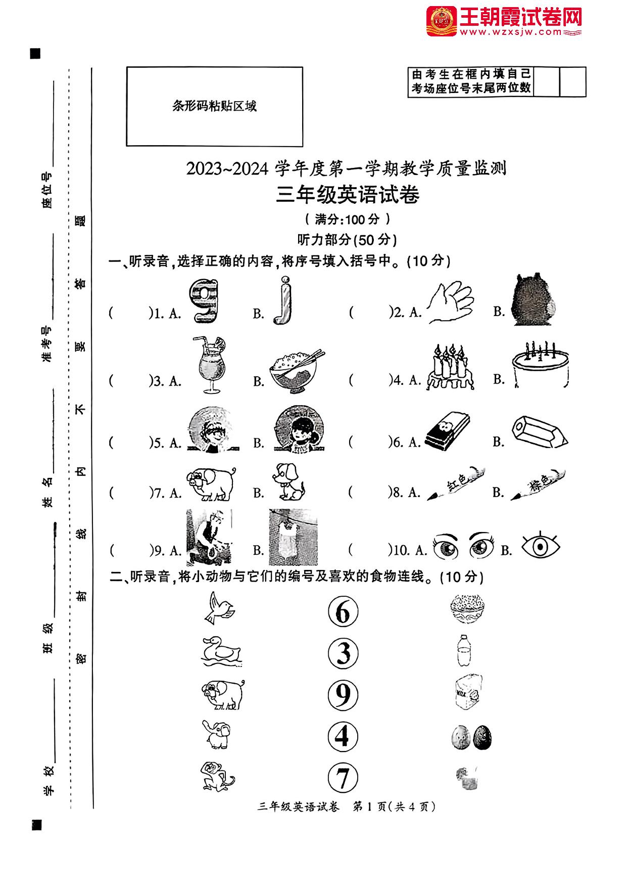 安徽省滁州市定远县2023-2024学年度第一学期教学质量监测三年级英语(人教PEP版)【无听力音频】