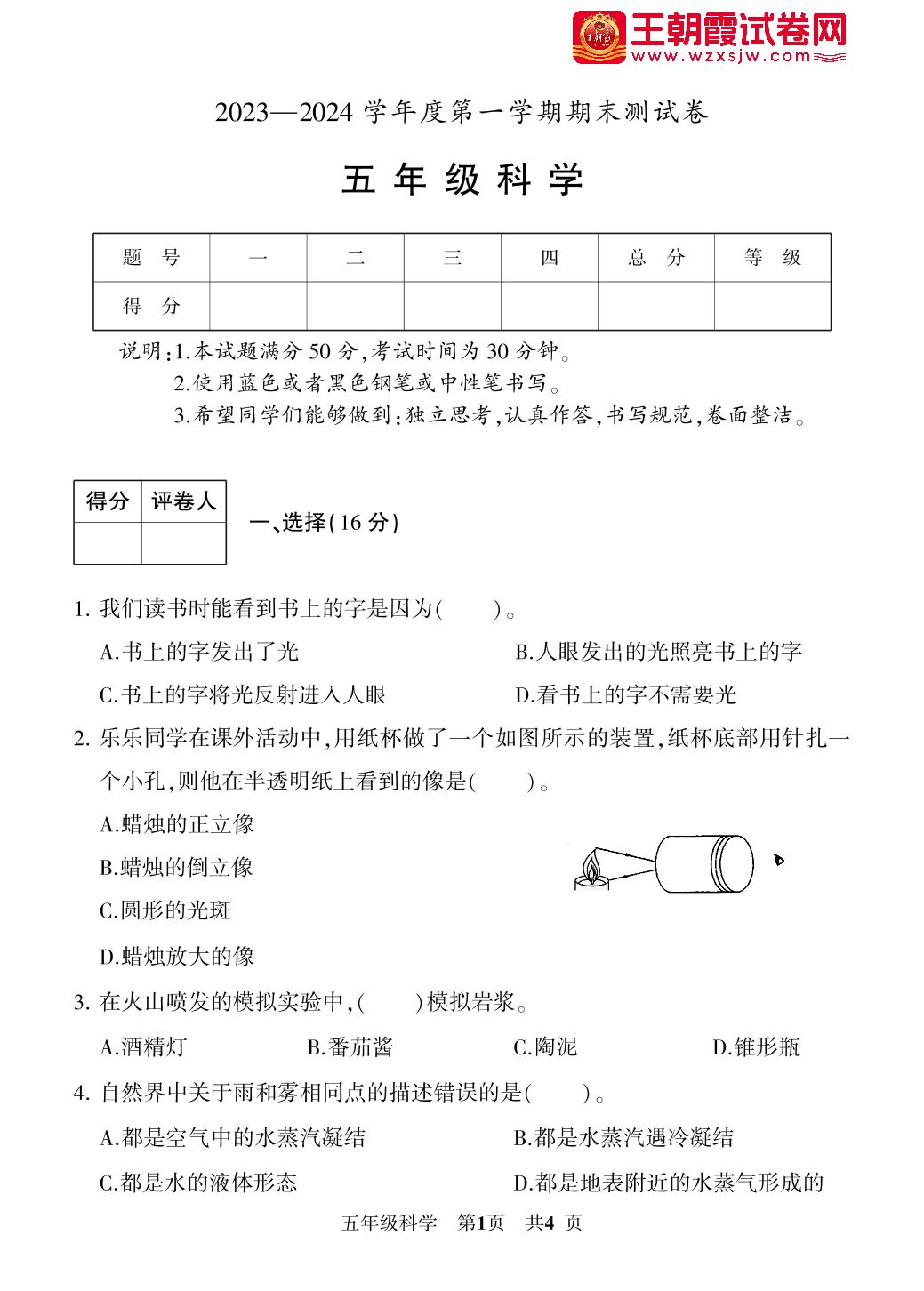 山西省临汾市侯马市2023-2024学年度第一学期期末测试卷五年级科学(苏教版)