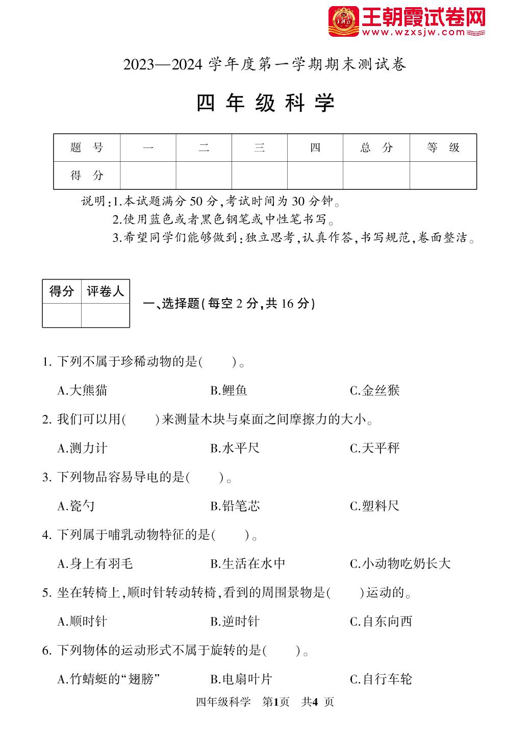 四年级科学苏教版上册期末卷