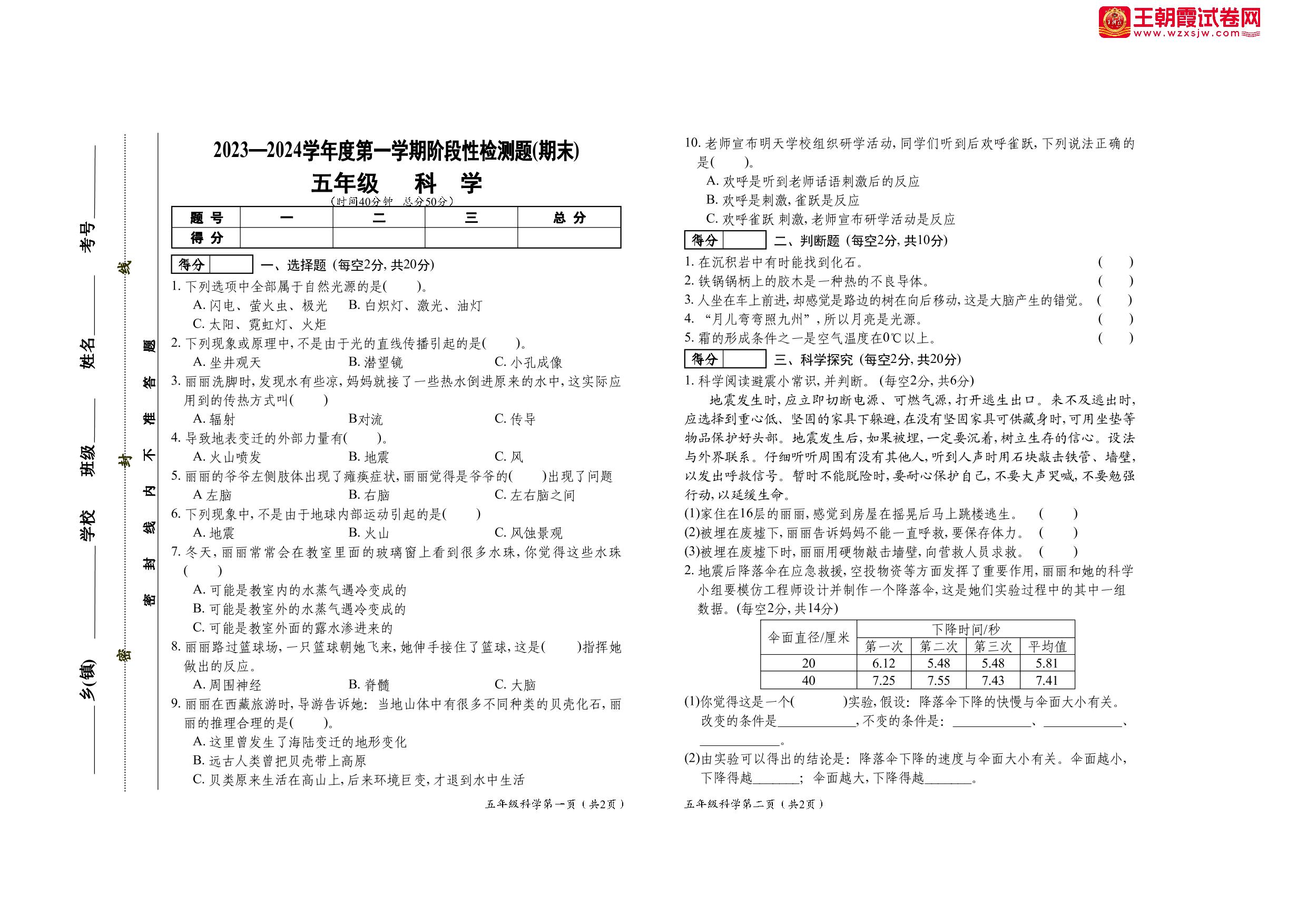 五年级科学苏教版上册期末卷