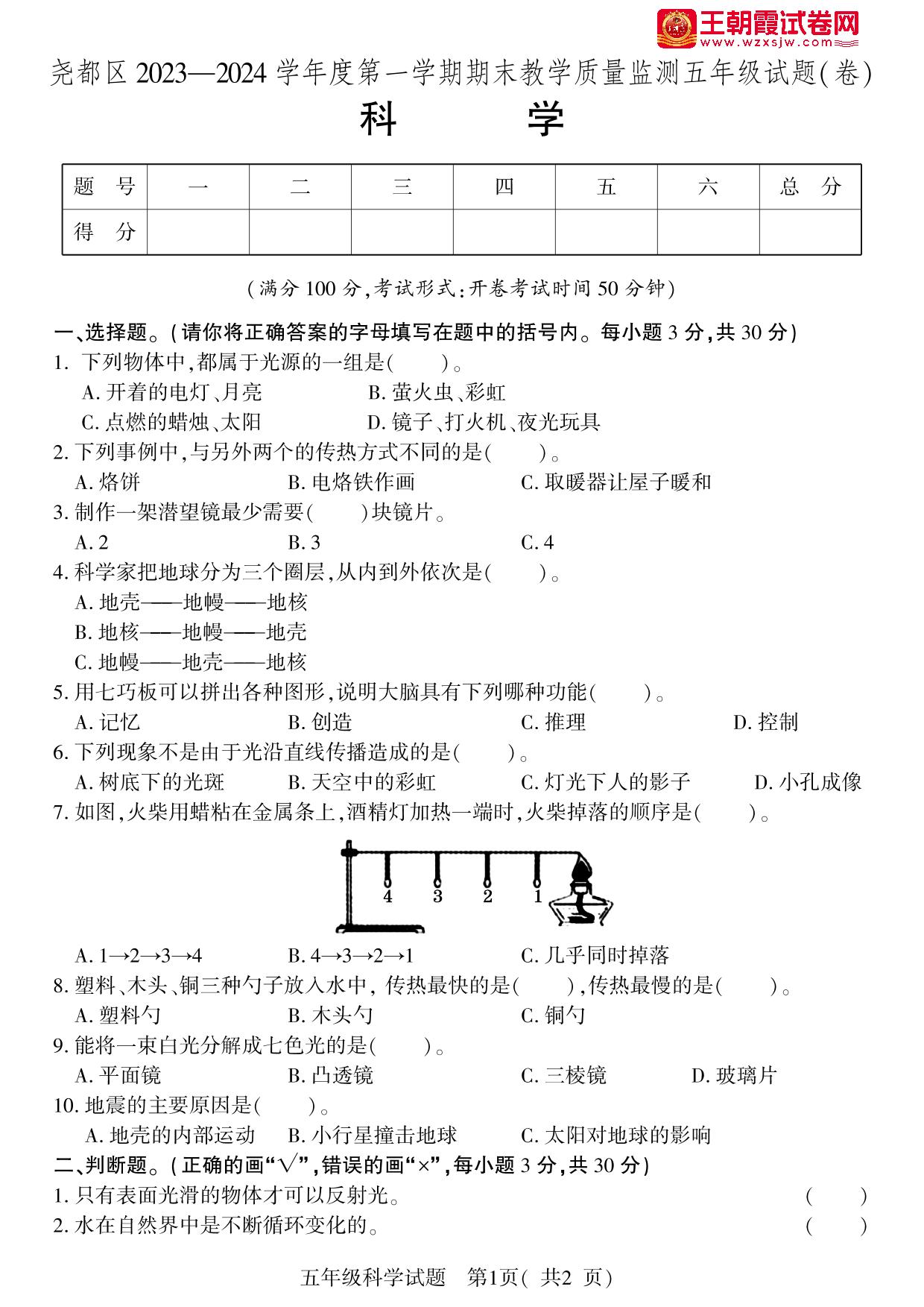山西省临汾市尧都区2023-2024学年度第一学期期末教学质量监测五年级科学(苏教版)