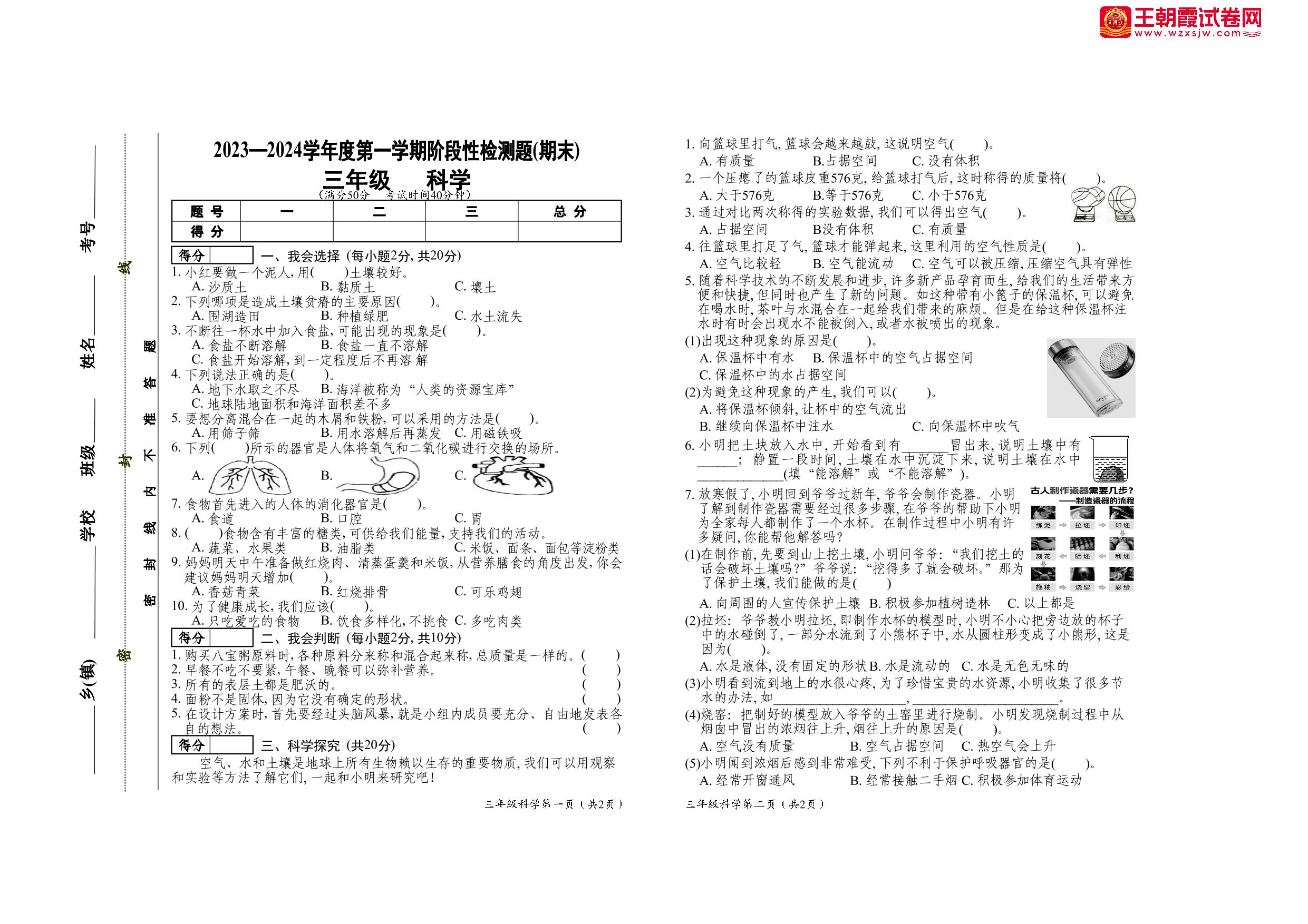 三年级科学苏教版上册期末卷