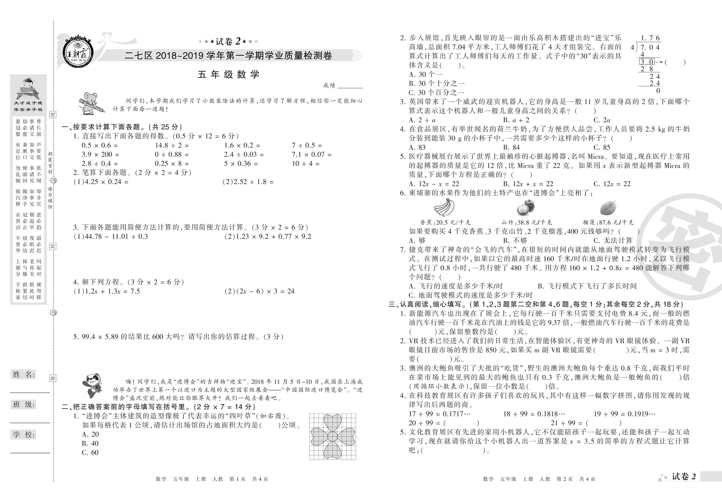 2018-2019学年第一学期郑州市二七区五年级数学试卷(人教版)【2】