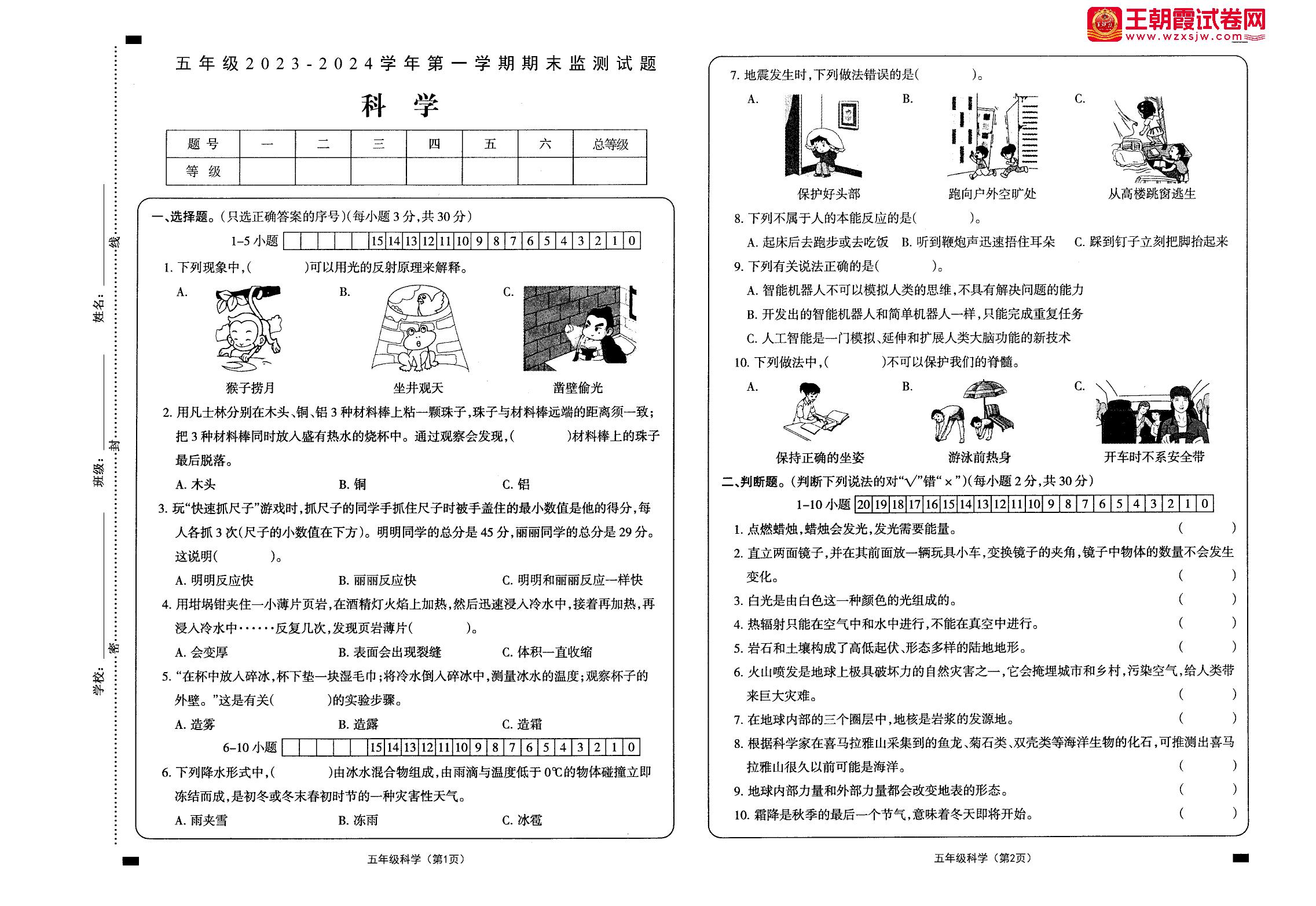 山西省大同市2023-2024学年第一学期期末监测试题五年级科学(苏教版)