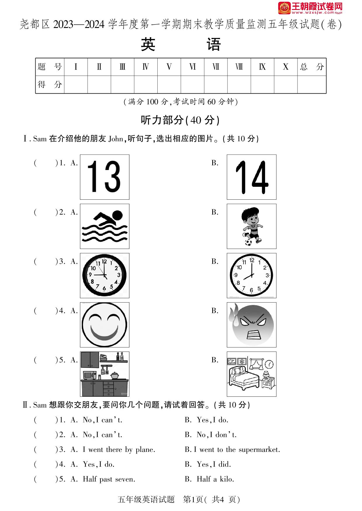 山西省临汾市尧都区2023-2024学年度第一学期期末教学质量监测五年级英语(外研版)【无听力音频】
