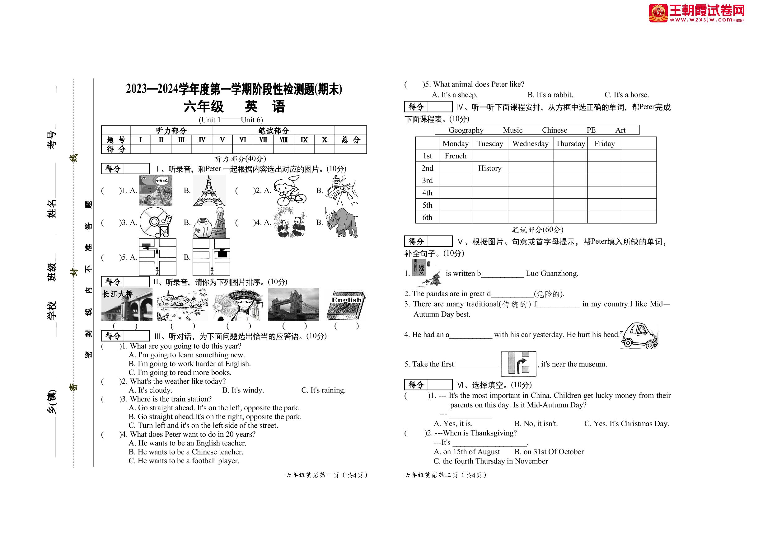 山西省晋中市祁县2023-2024学年度第一学期阶段性检测题(期末)六年级英语(外研版)【无听力音频】