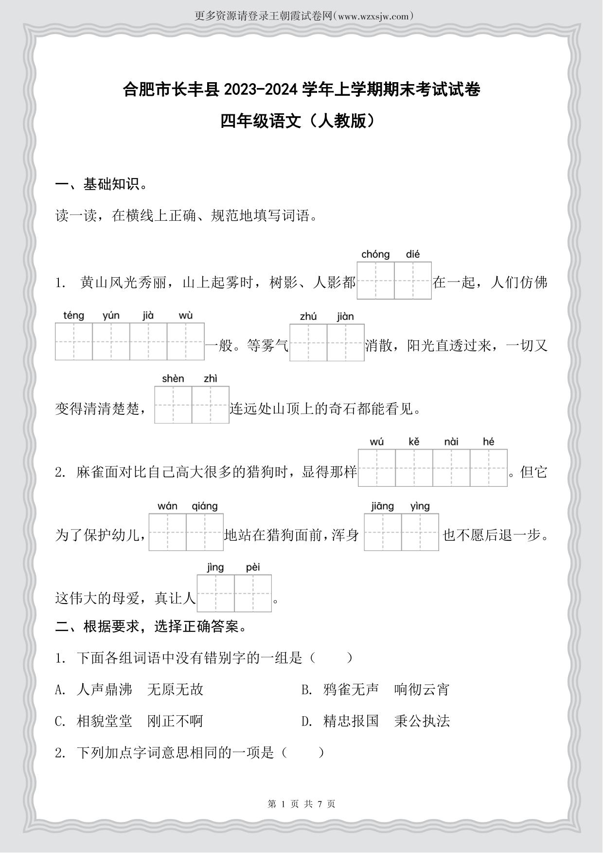 安徽省合肥市长丰县2023-2024学年上学期期末考试试卷四年级语文(人教版)