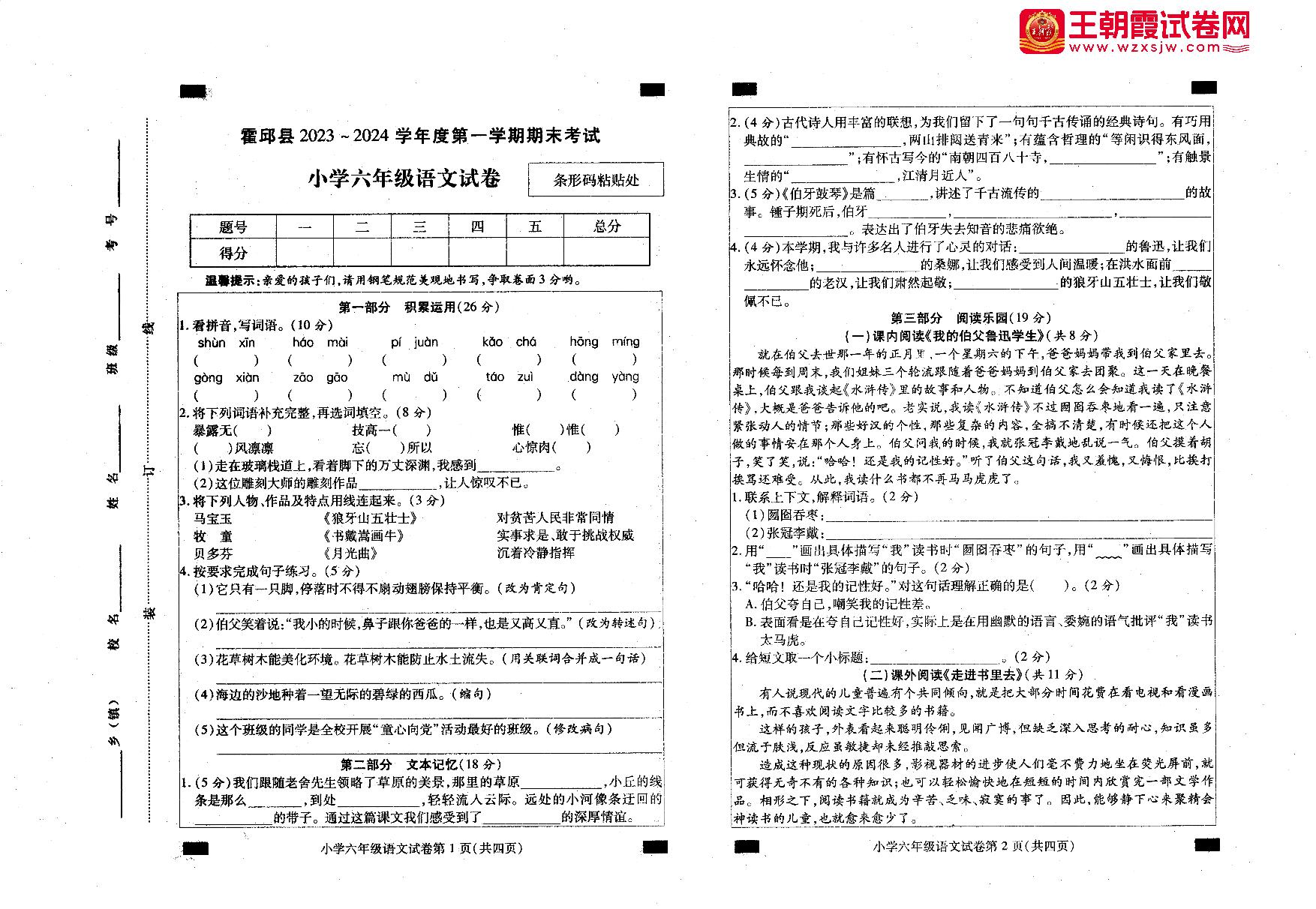 安徽省六安市霍邱县2023-2024学年度第一学期期末考试六年级语文(人教版)