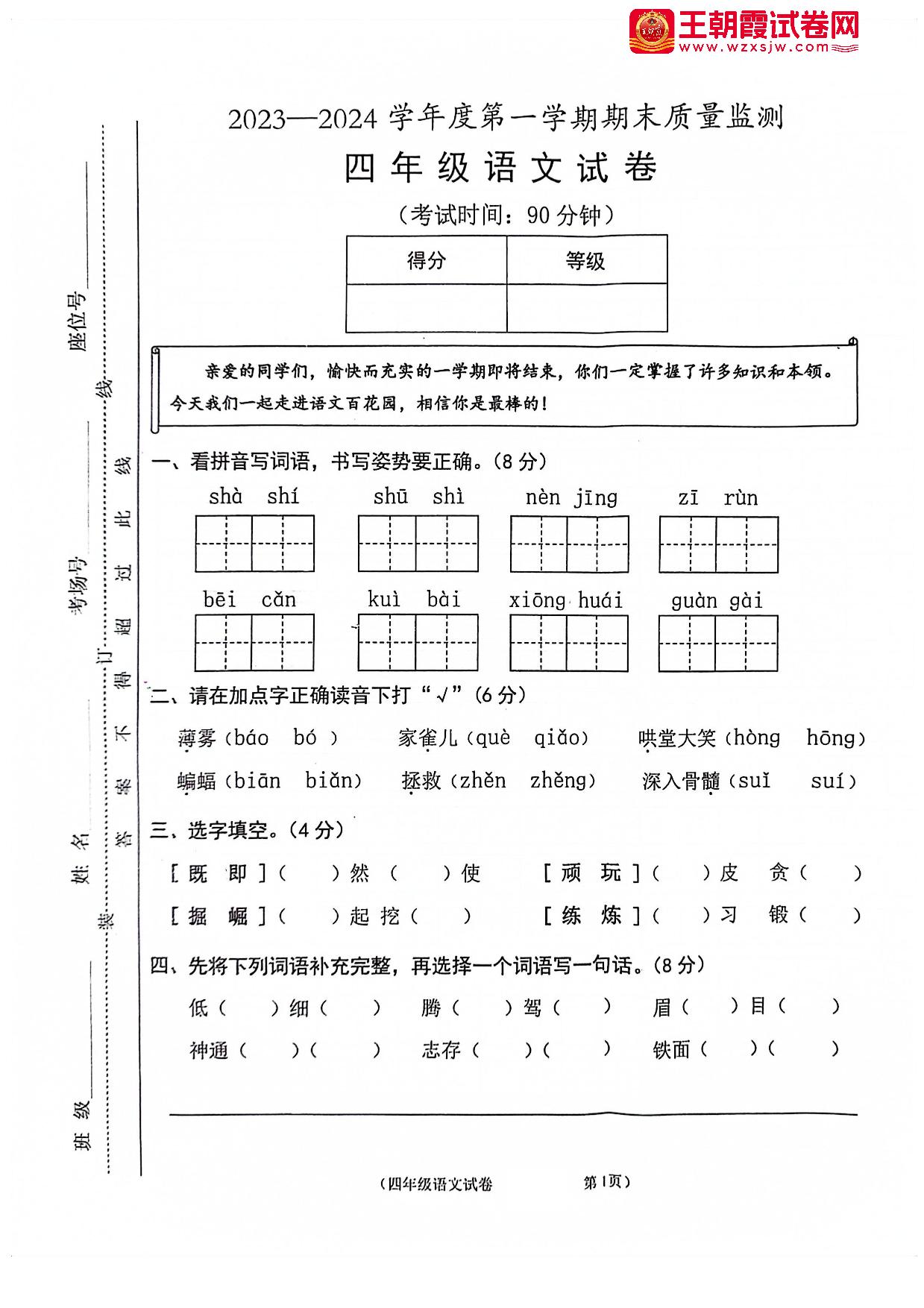 安徽省铜陵市2023-2024学年度第一学期期末质量监测四年级语文(人教版)