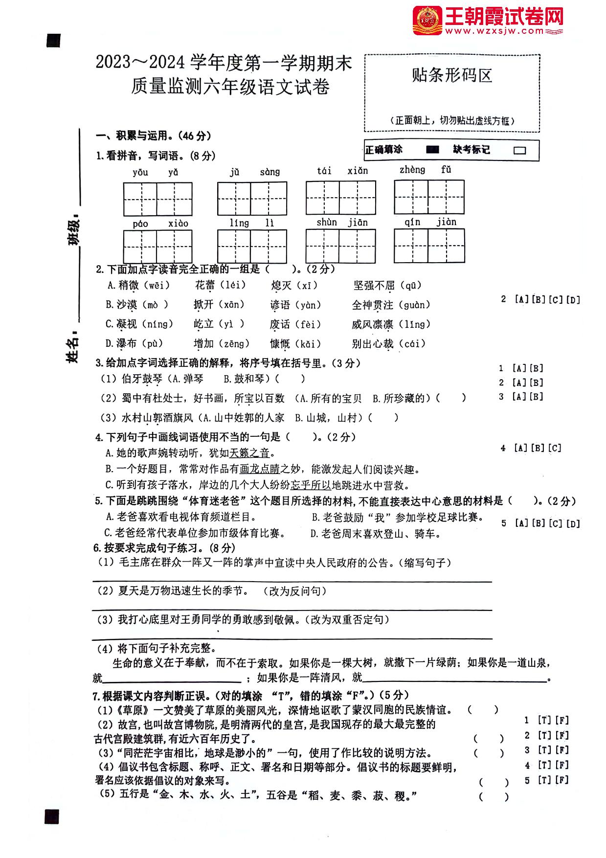 六年级语文人教版上册期末卷