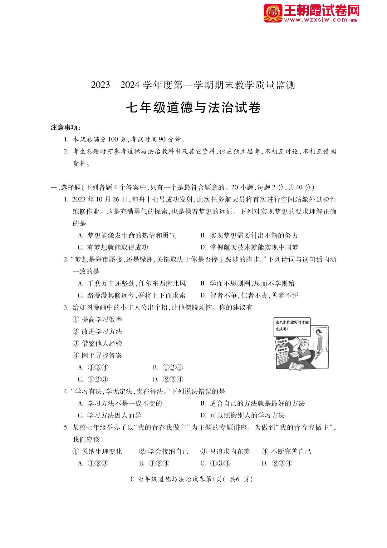 安徽省宣城市2023-2024学年度第一学期期末教学质量监测七年级道德与法治(人教版)
