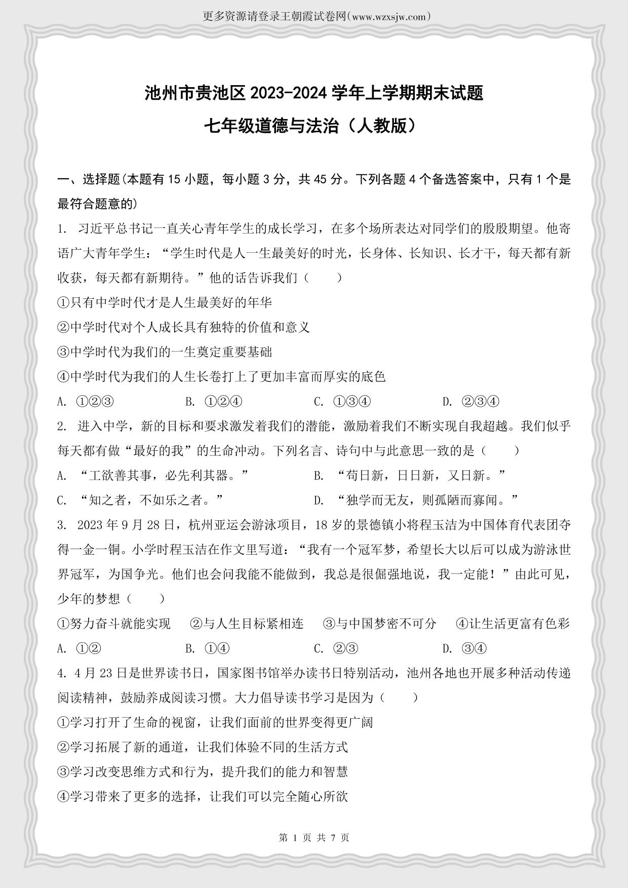 安徽省池州市贵池区2023-2024学年上学期期末试题七年级道德与法治(人教版)