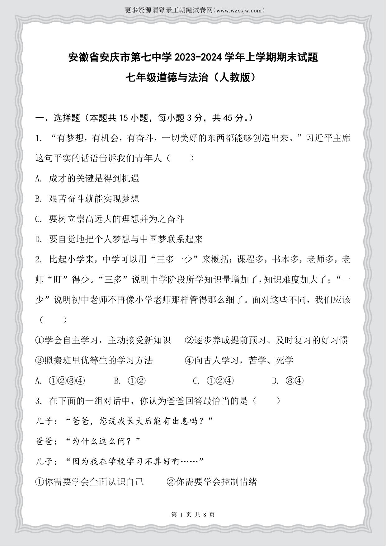 安徽省安庆市第七中学2023-2024学年上学期期末试题七年级道德与法治(人教版)