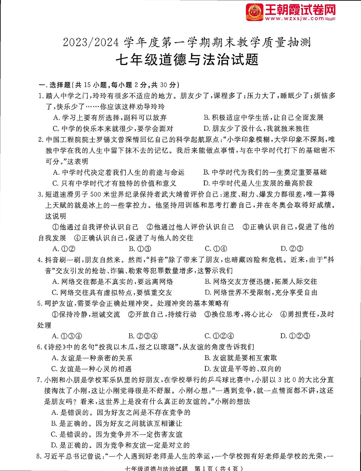 安徽省合肥市庐江县2023-2024学年第一学期期末教学质量抽测七年级道德与法治(人教版)