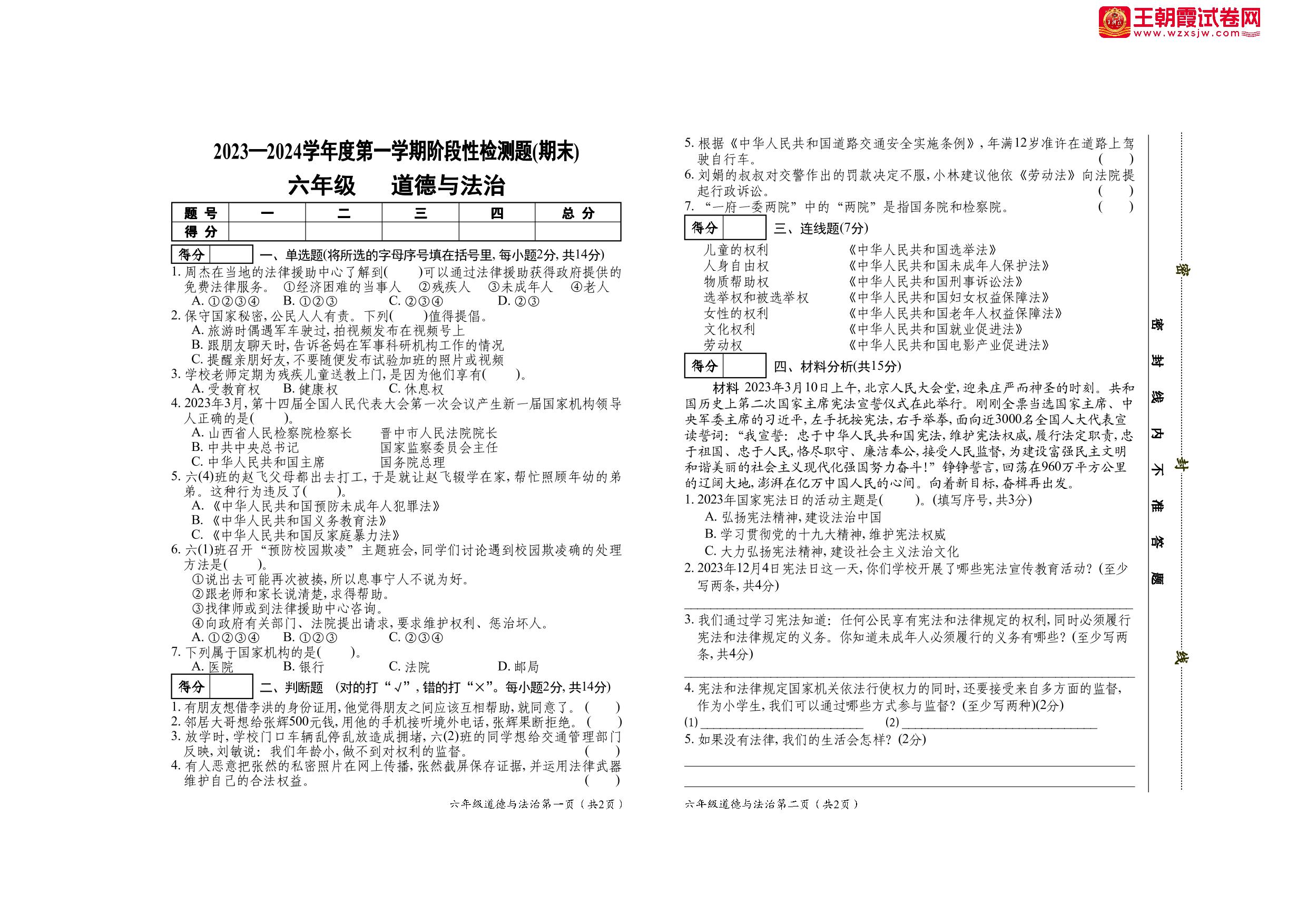山西省晋中市祁县2023-2024学年度第一学期阶段性检测题(期末)六年级道德与法治(人教版)