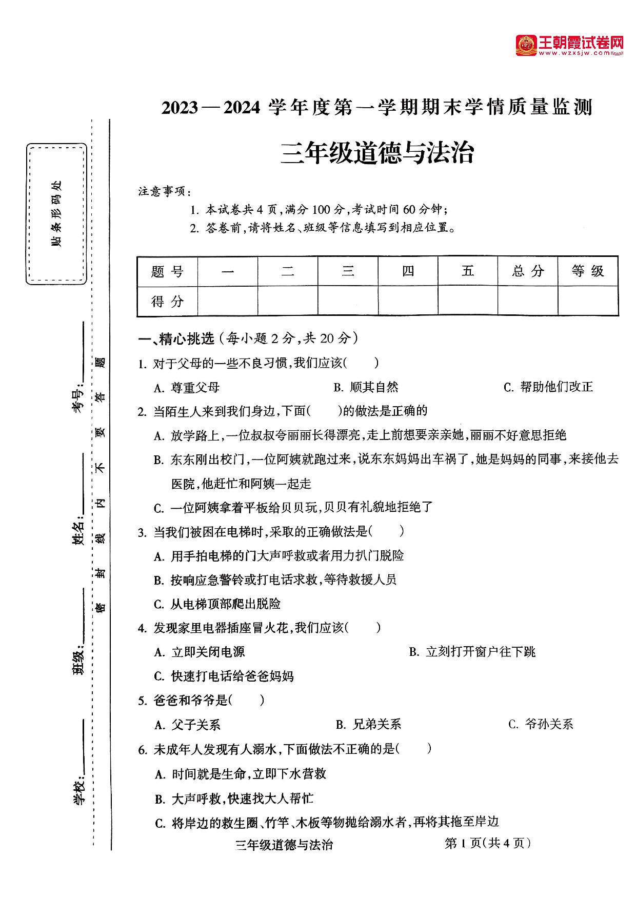 山西省朔州市怀仁市怀仁县新桥小学2023-2024学年度第一学期期末学情质量监测三年级道德与法治(人教版)
