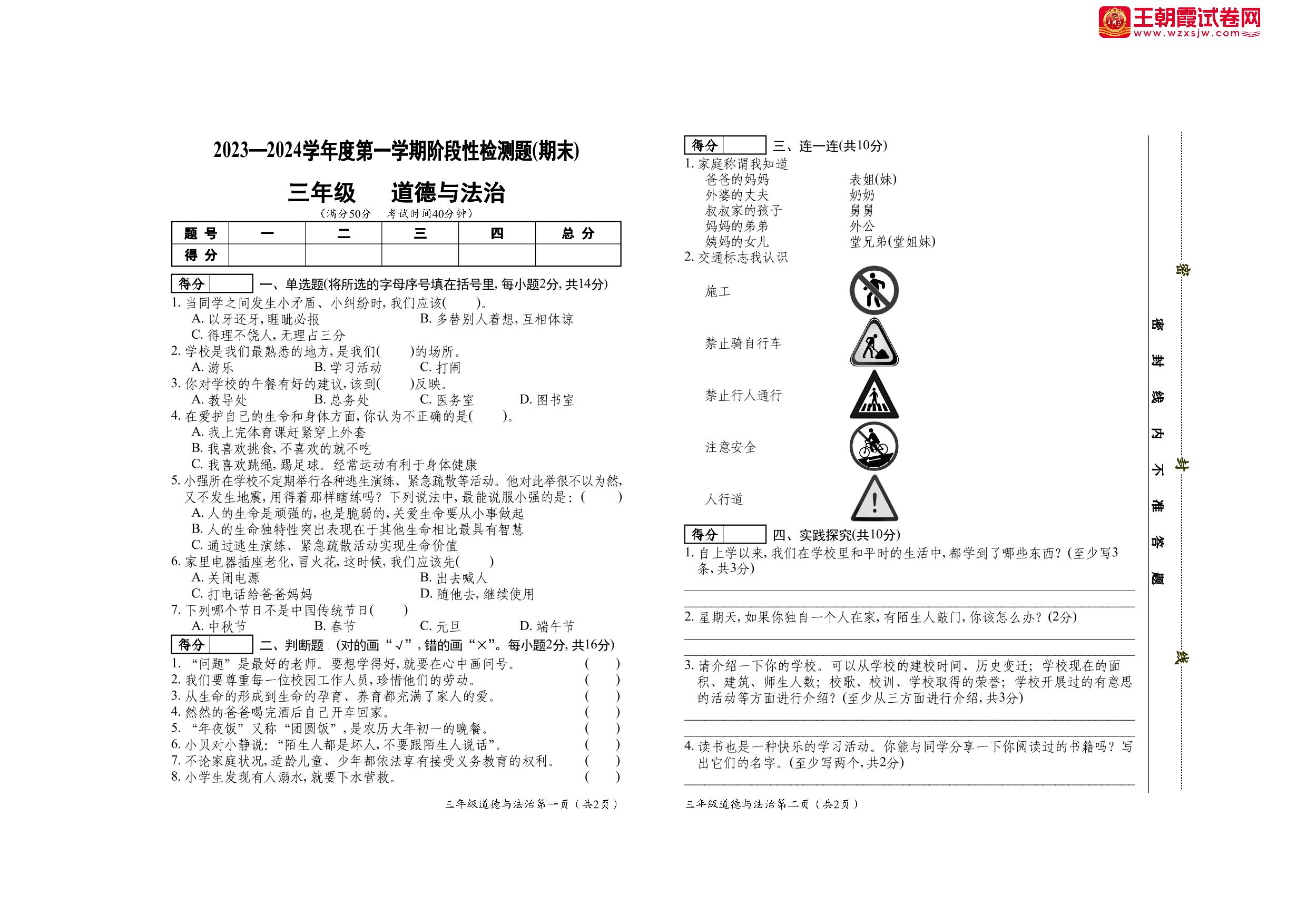 山西省晋中市祁县2023-2024学年度第一学期阶段性检测题(期末)三年级道德与法治(人教版)