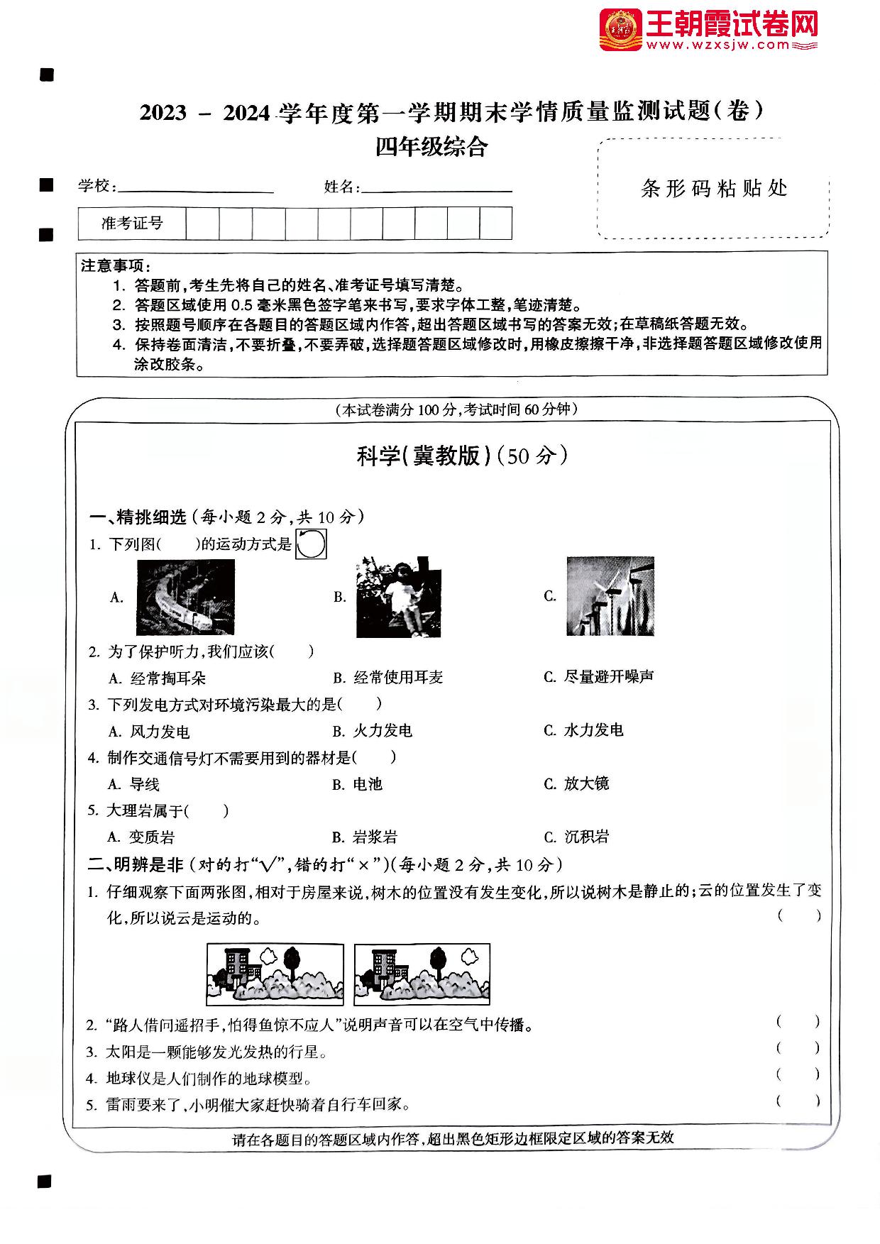山西省忻州市2023-2024学年度第一学期期末学情质量监测试题(卷)四年级道德与法治、科学综合卷