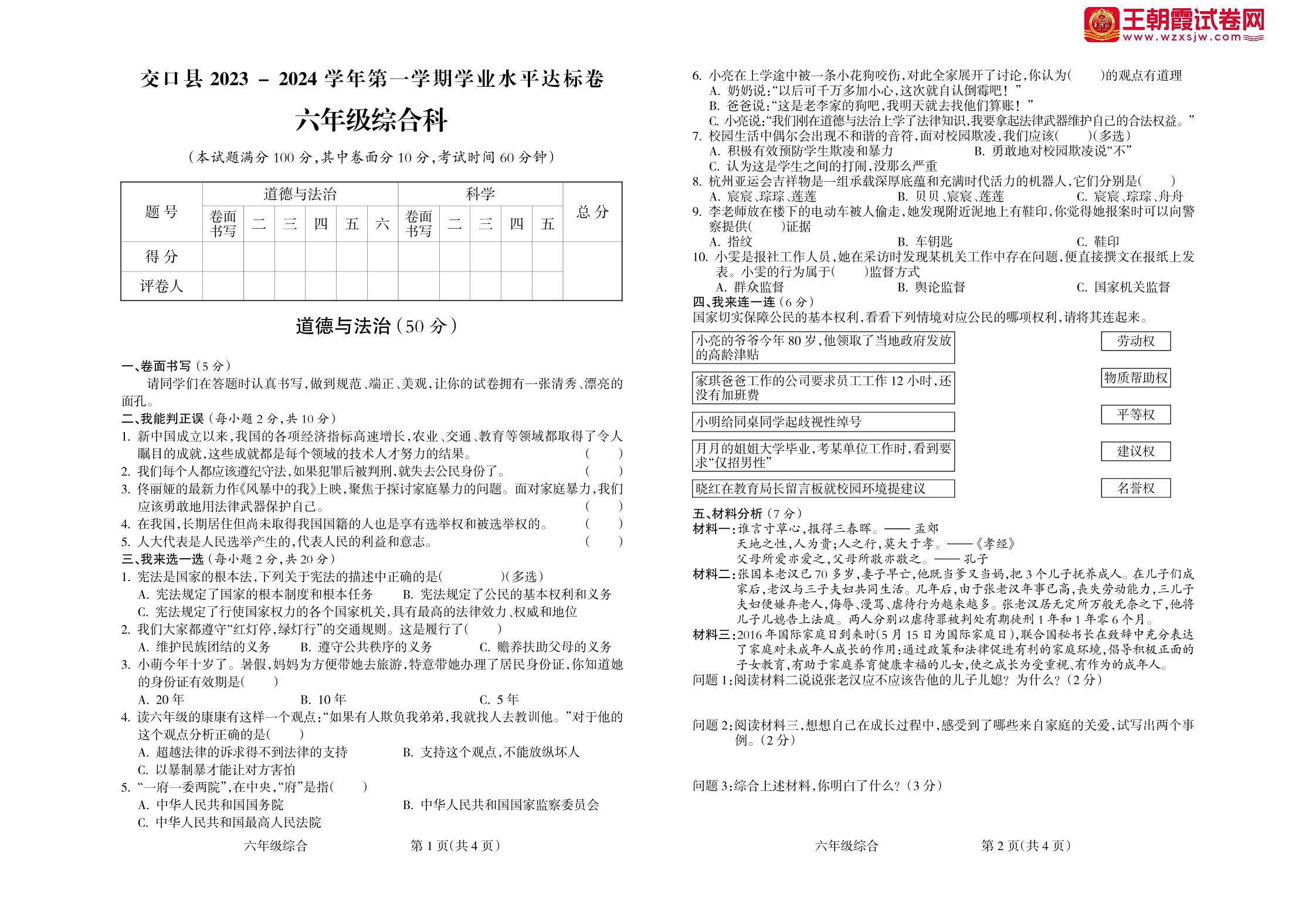 山西省吕梁市交口县2023-2024学年第一学期学业水平达标卷六年级道德与法治、科学综合卷