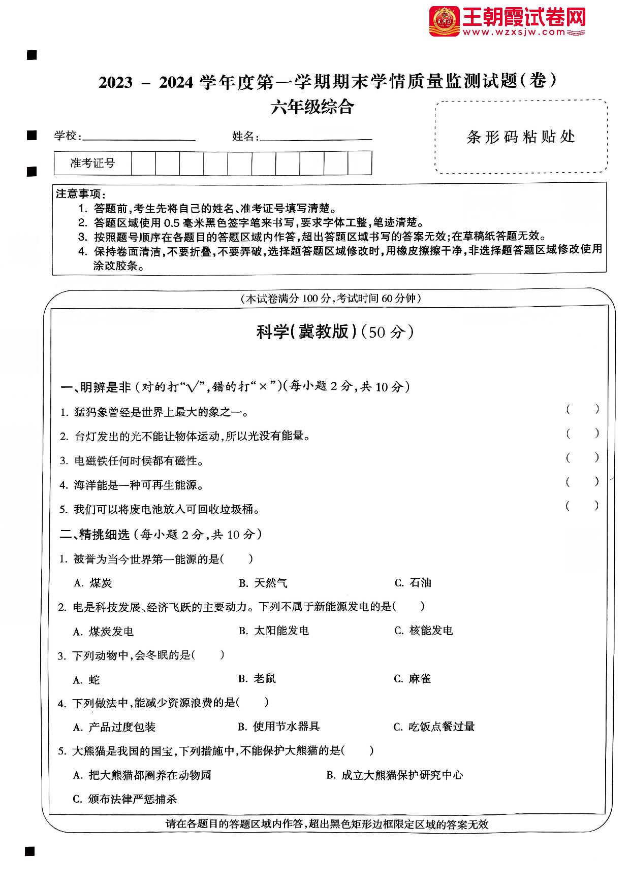 山西省忻州市2023-2024学年度第一学期期末学情质量监测试题(卷)六年级道德与法治、科学综合卷