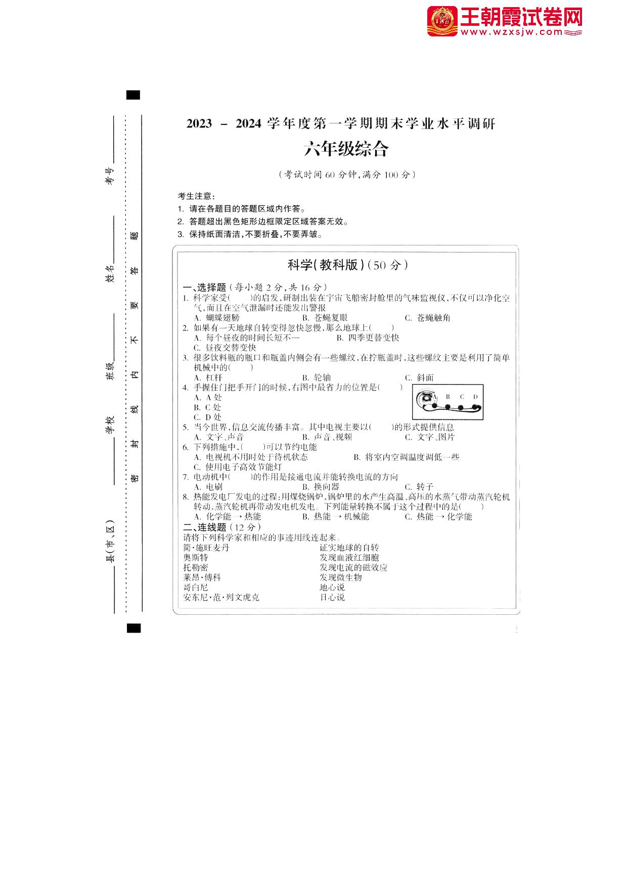 山西省晋城市2023-2024学年度第一学期期末学业水平调研六年级道德与法治、科学综合卷