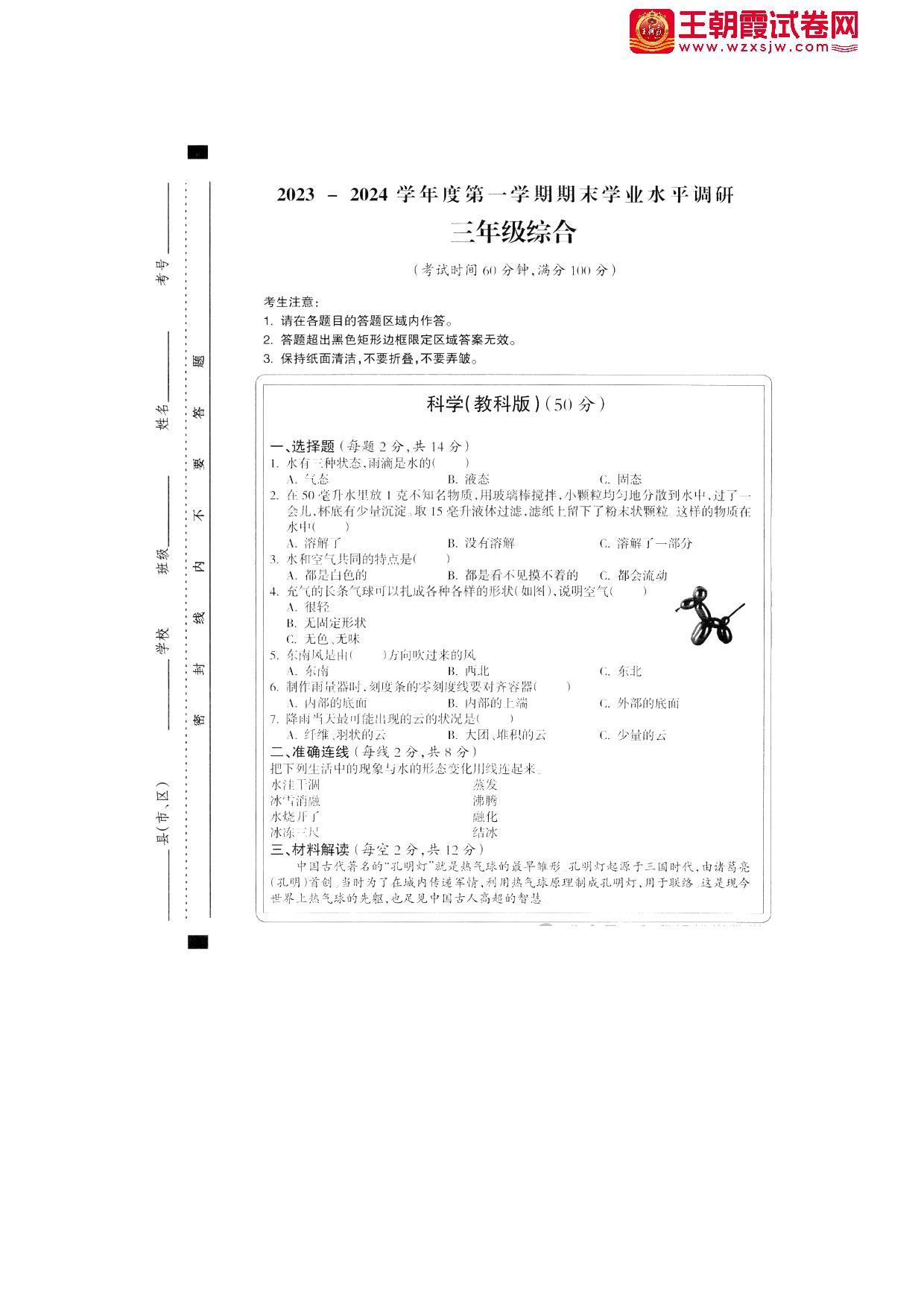 山西省晋城市2023-2024学年度第一学期期末学业水平调研三年级道德与法治、科学综合卷