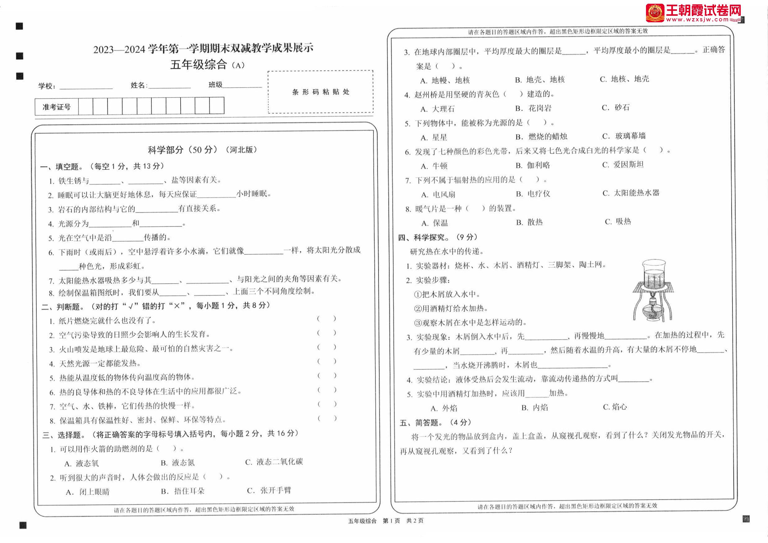 山西省忻州市2023-2024学年第一学期期末双减教学成果展示五年级道德与法治、科学综合卷