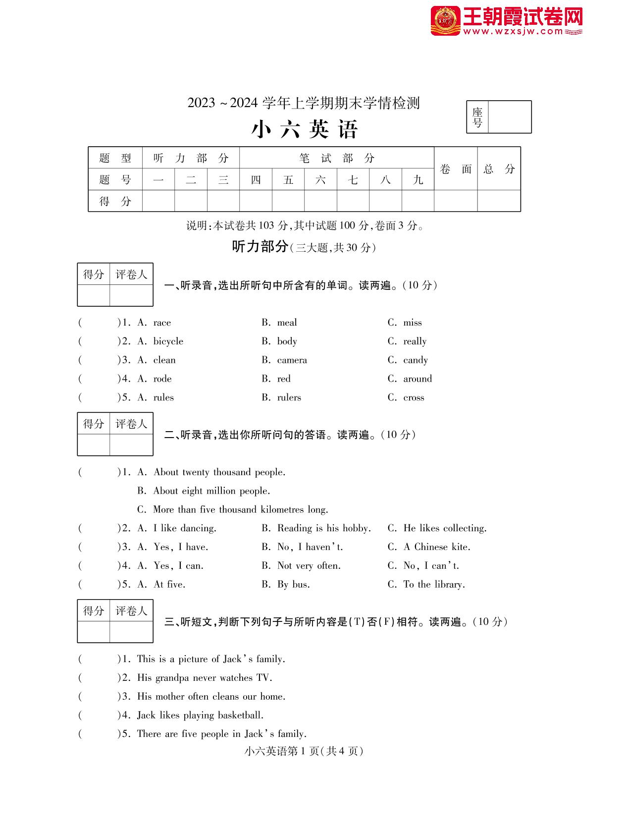 河南省平顶山市郏县2023-2024学年上学期期末学情检测六年级英语(外研版·三起始)【无听力音频】