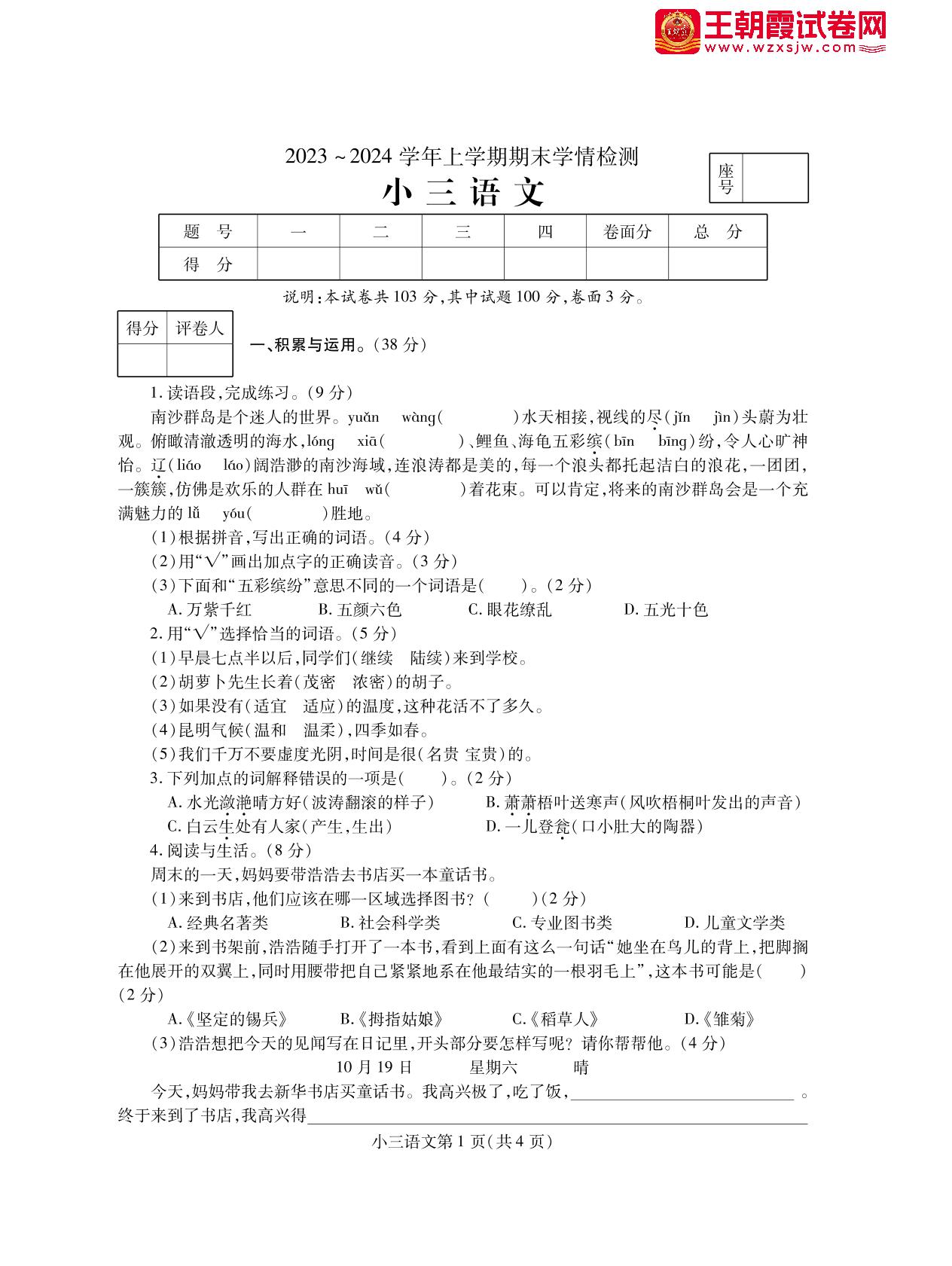 河南省平顶山市郏县2023-2024学年上学期期末学情检测三年级语文(人教版)