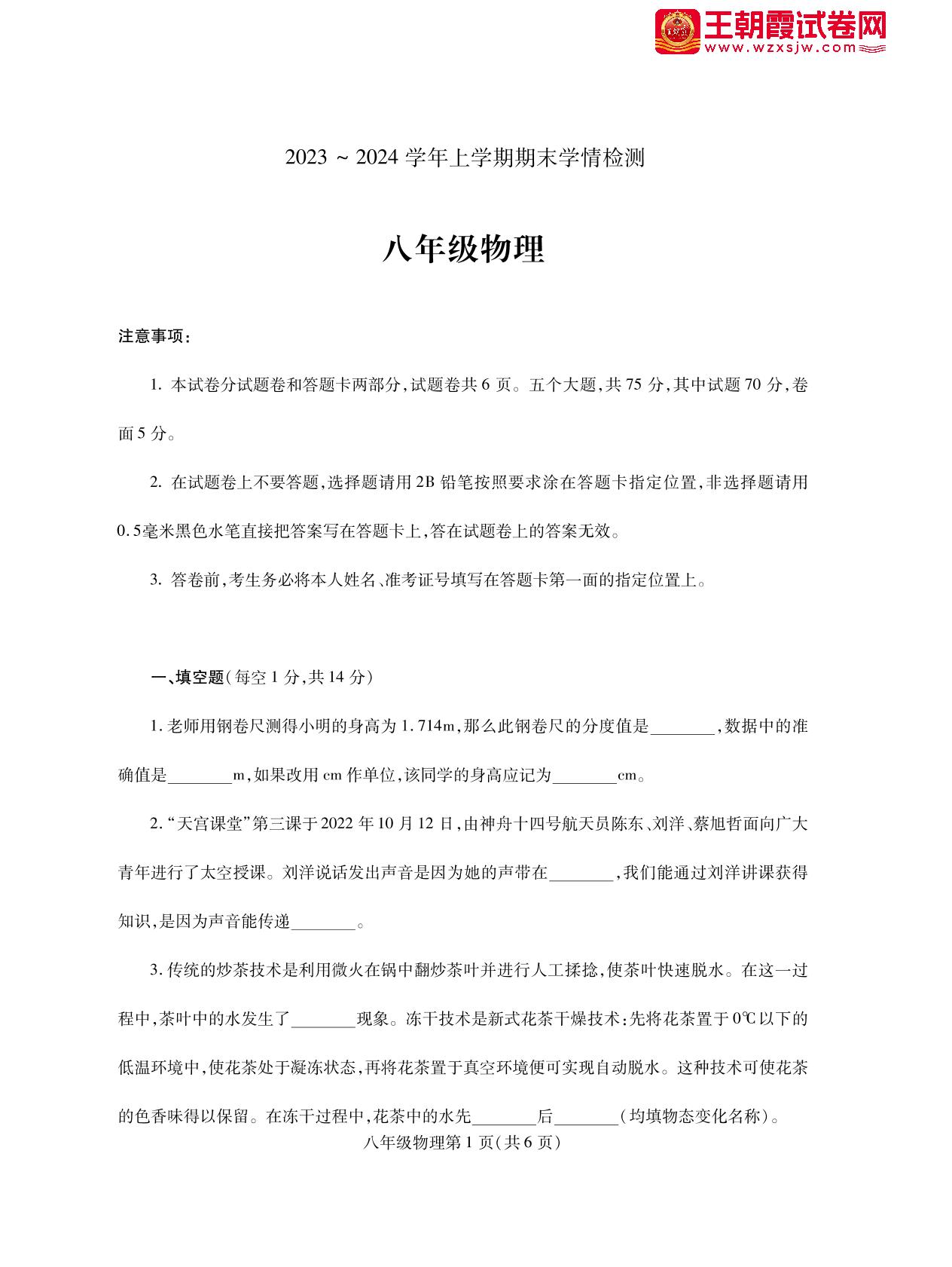 八年级物理人教版上册期末卷