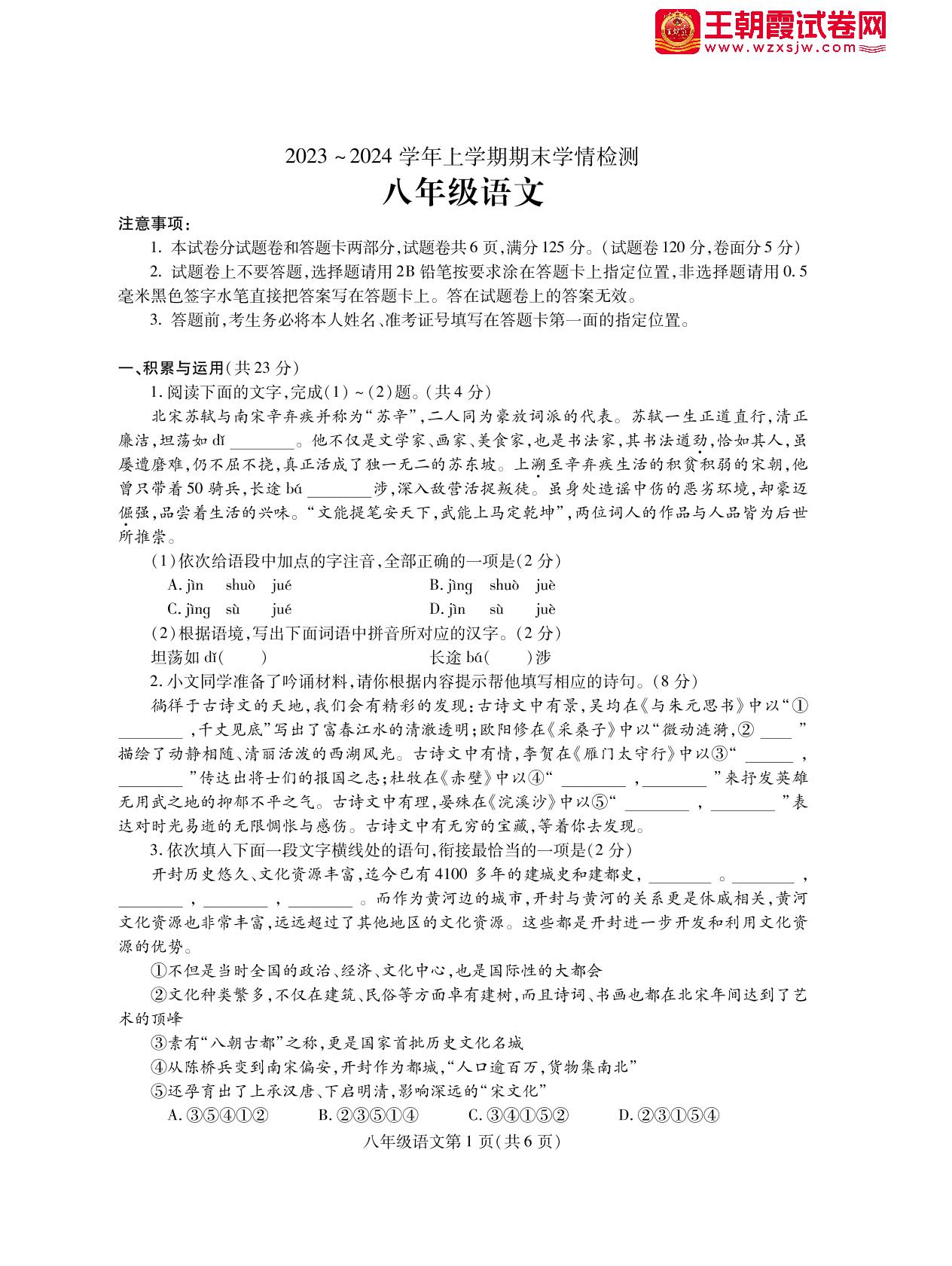 河南省平顶山市郏县2023-2024学年上学期期末学情检测八年级语文(人教版)