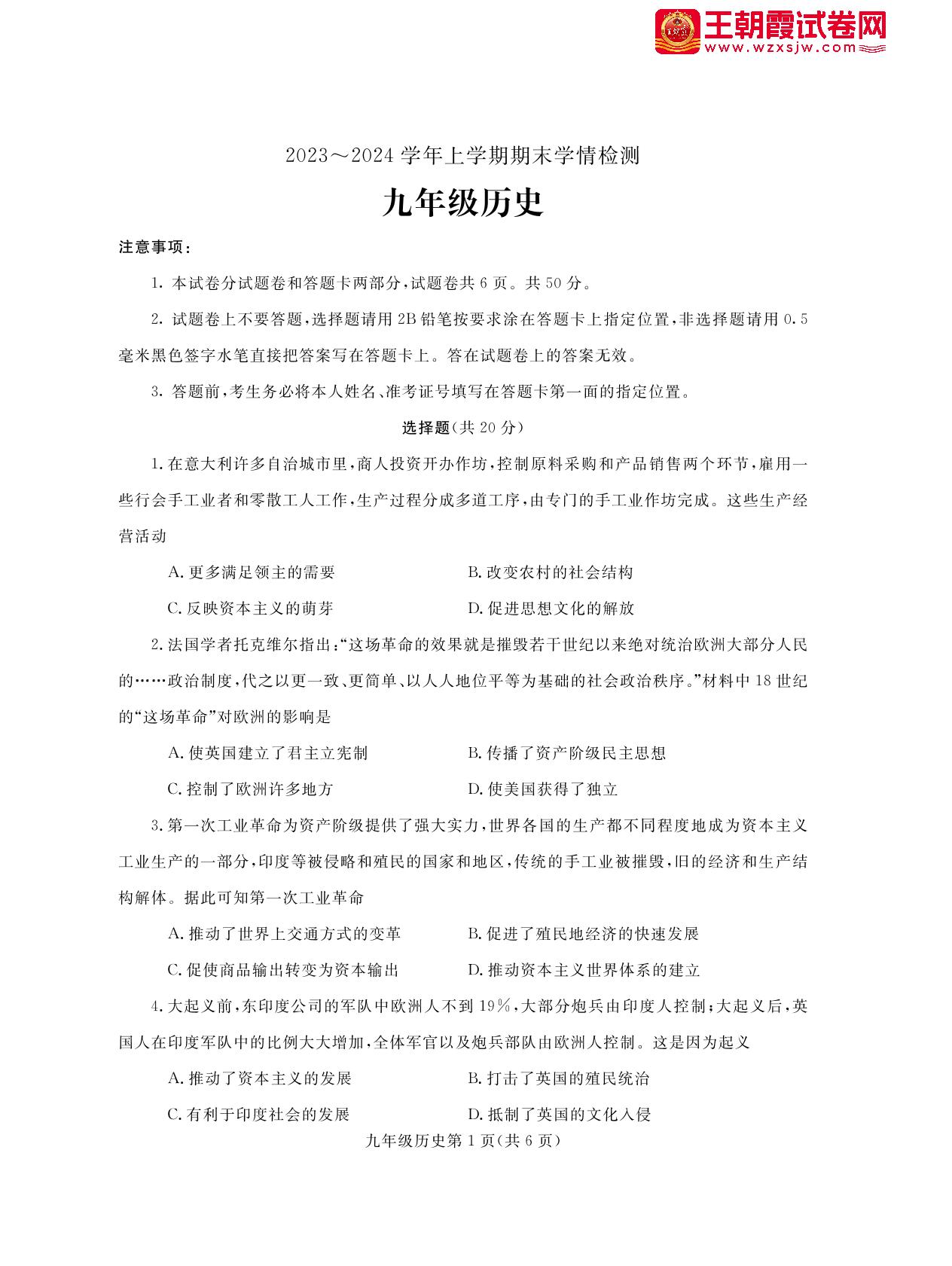 河南省平顶山市郏县2023-2024学年上学期期末学情检测九年级历史(人教版)