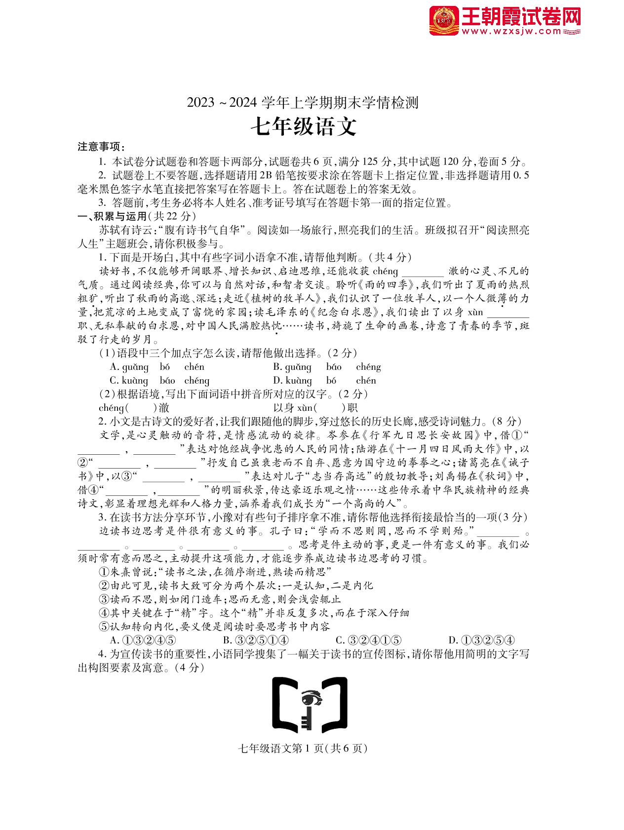 河南省平顶山市郏县2023-2024学年上学期期末学情检测七年级语文(人教版)