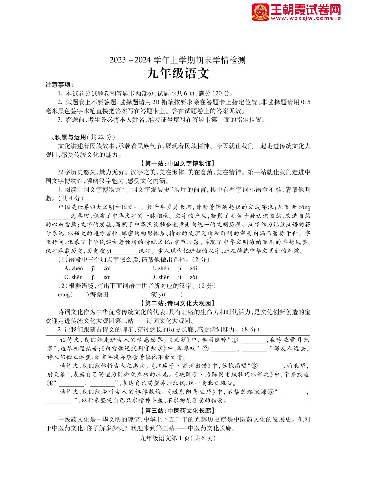 河南省平顶山市郏县2023-2024学年上学期期末学情检测九年级语文(人教版)