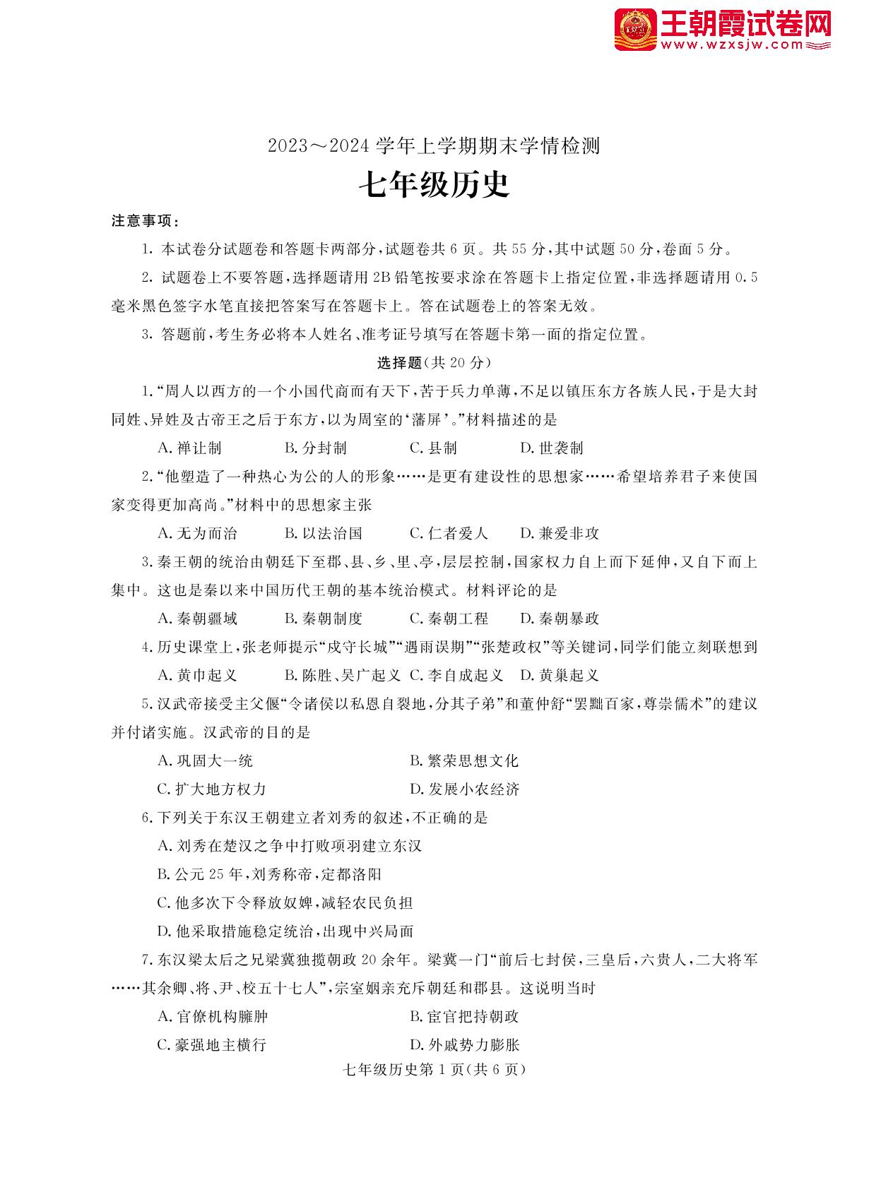河南省平顶山市郏县2023-2024学年上学期期末学情检测七年级历史(人教版)