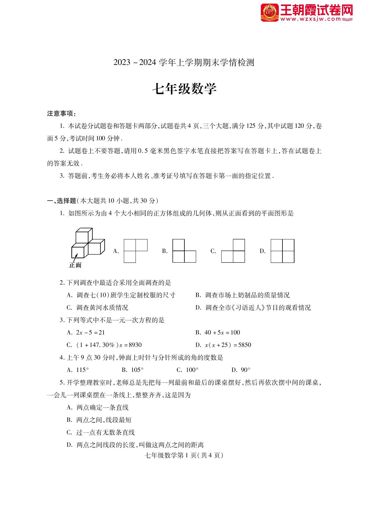 河南省平顶山市郏县2023-2024学年上学期期末学情检测七年级数学(北师版)