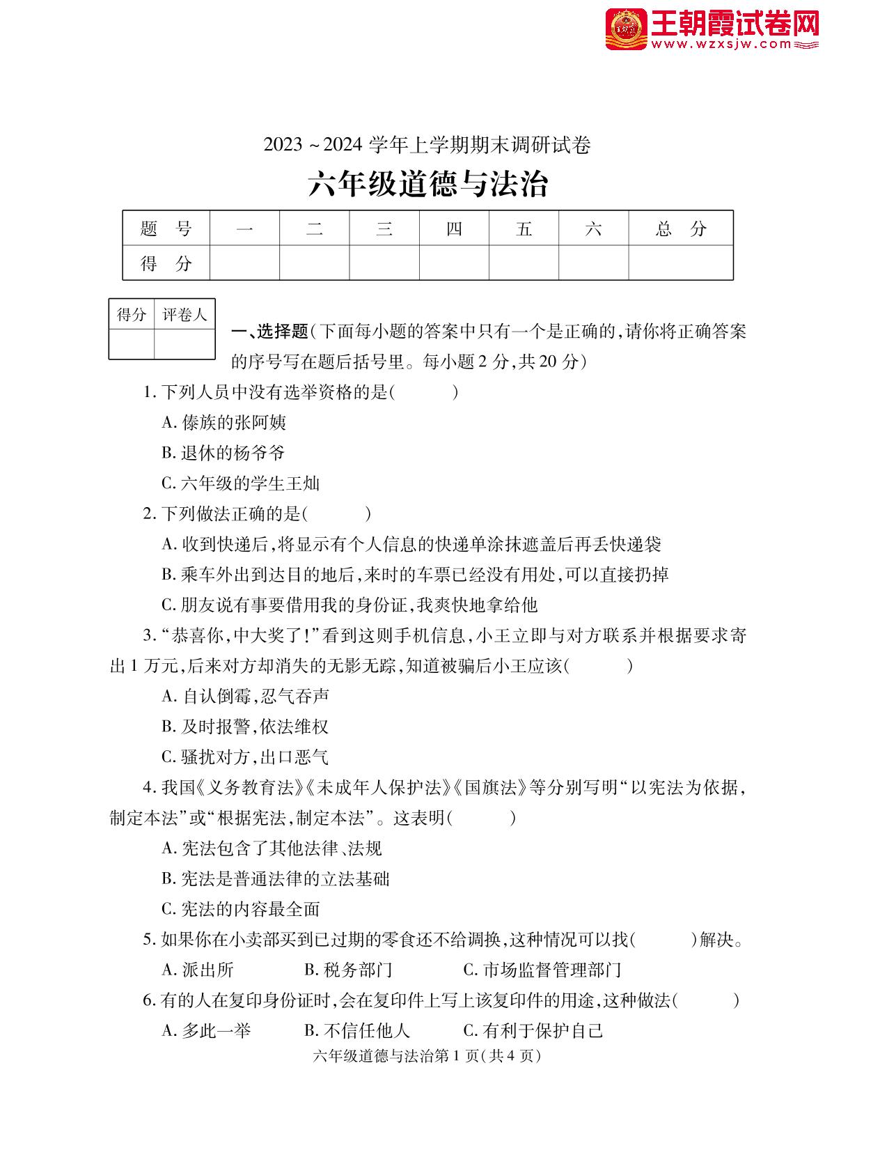 河南省平顶山市舞钢市2023-2024学年上学期期末调研试卷六年级道德与法治(人教版)