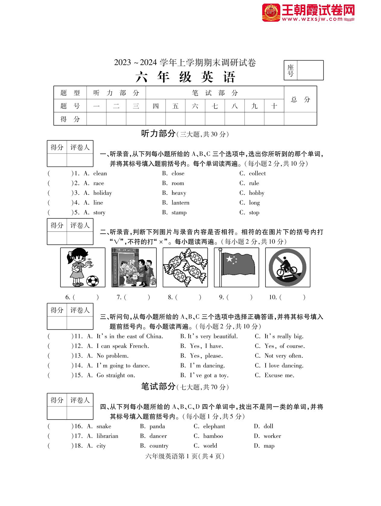 河南省平顶山市舞钢市2023-2024学年上学期期末调研试卷六年级英语(外研版·三起始)【无听力音频】