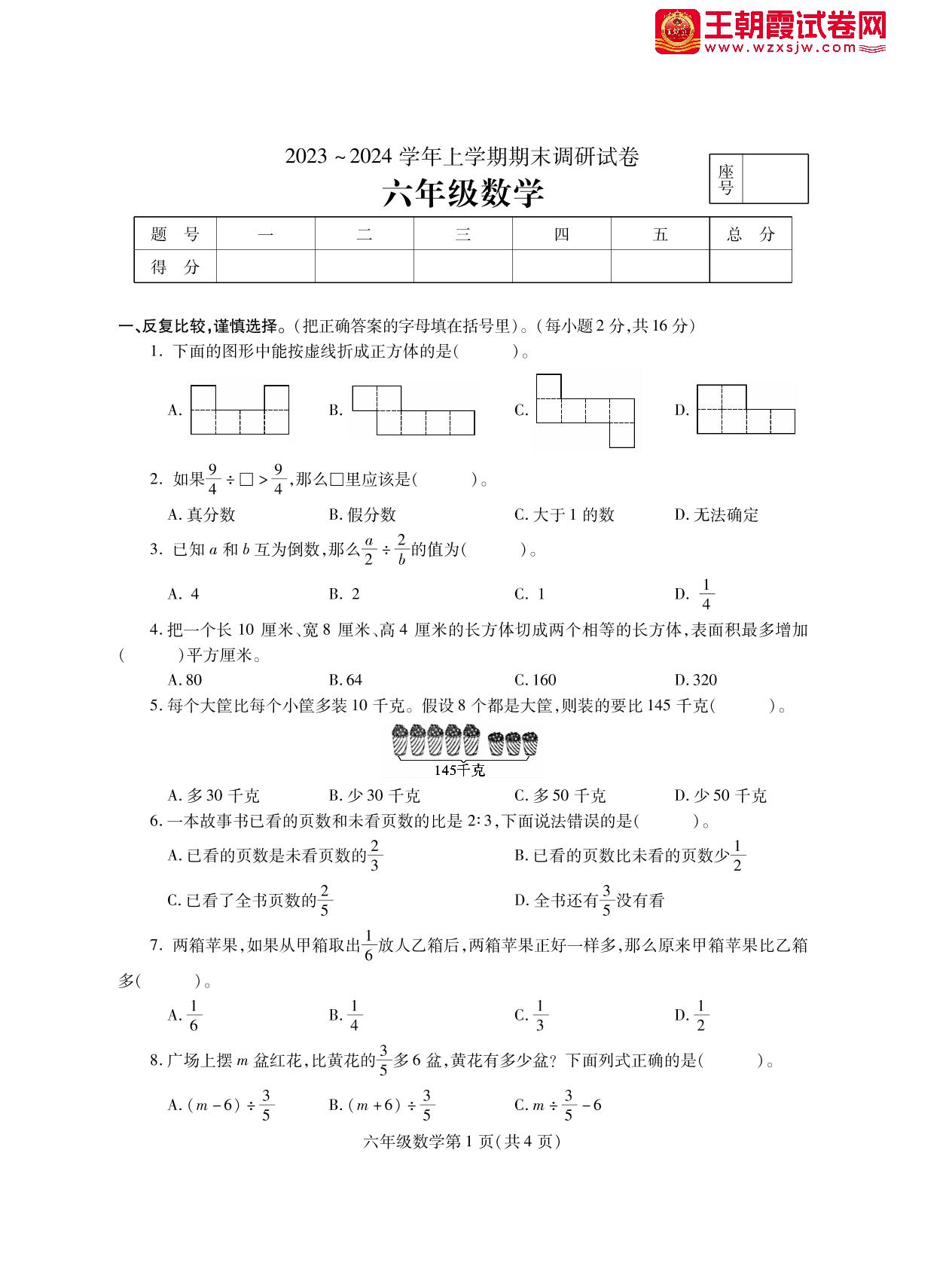 六年级数学苏教版上册期末卷