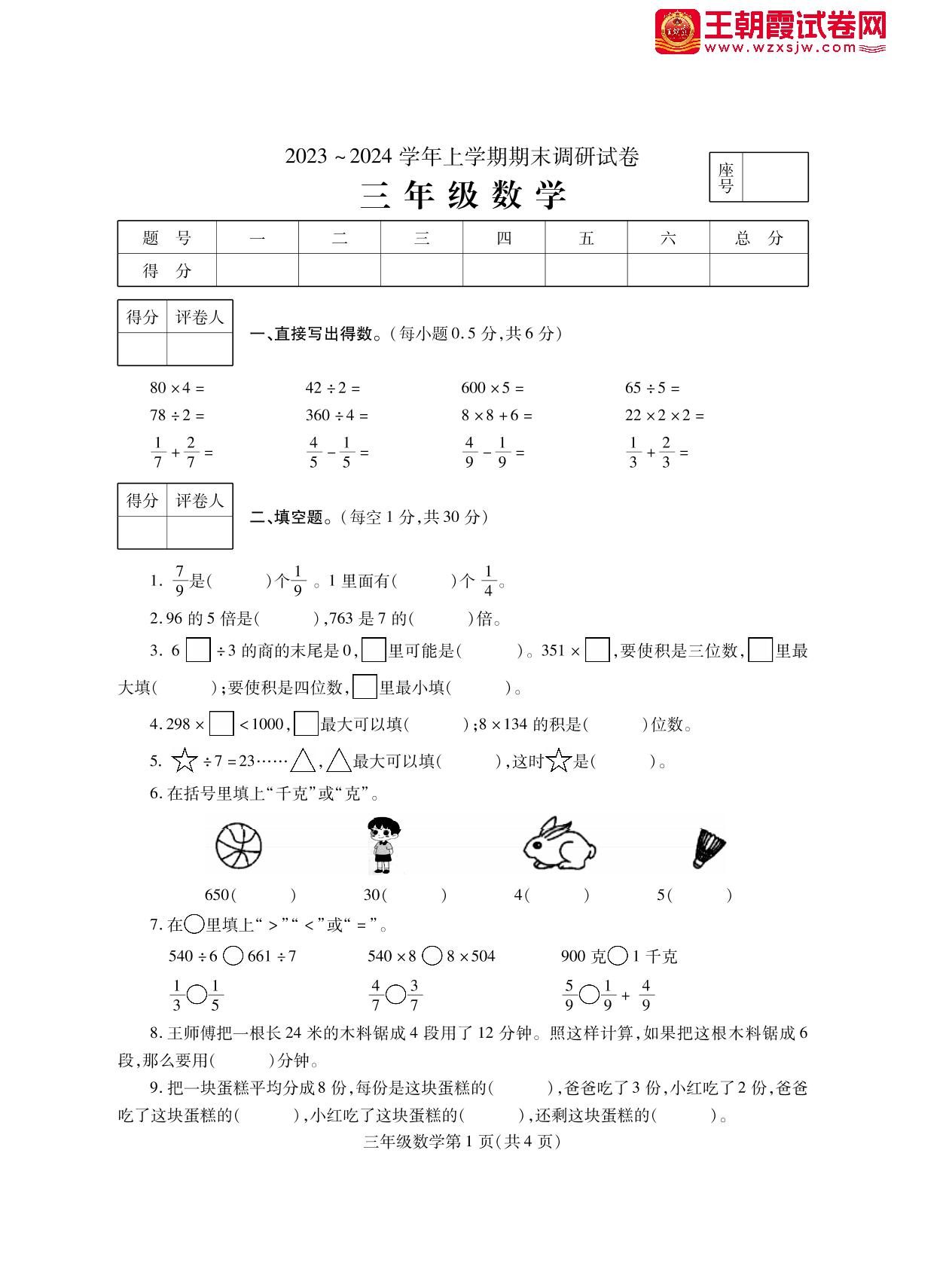 河南省平顶山市舞钢市2023-2024学年上学期期末调研试卷三年级数学(苏教版)
